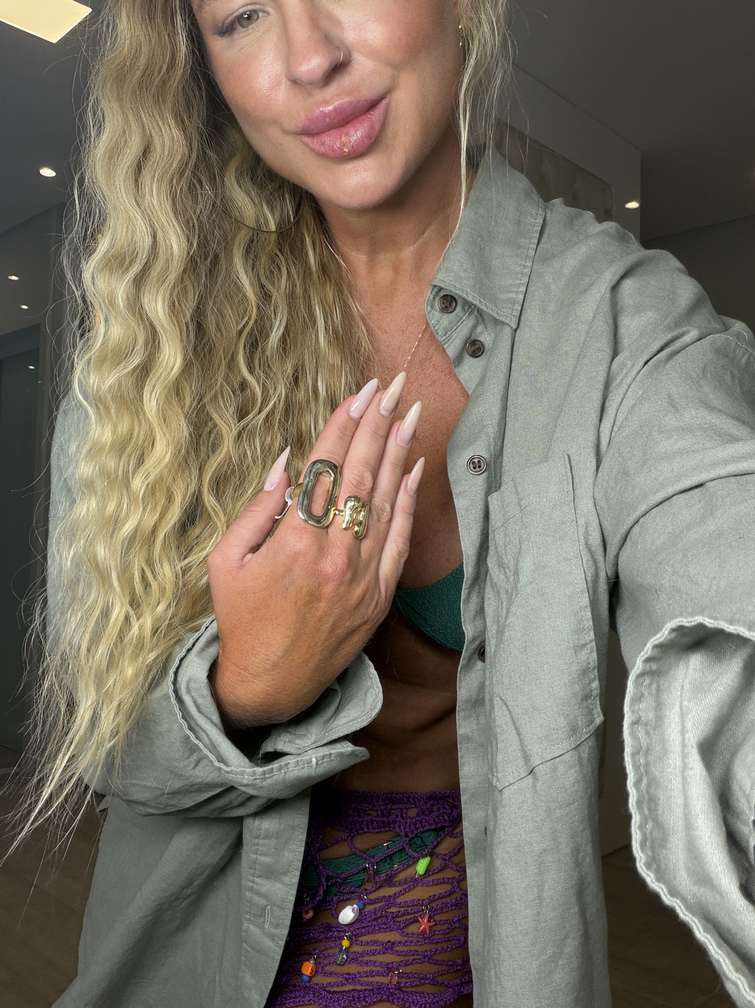 Anel duplo dourado moderno com design curvado e abertura frontal, trazendo um toque contemporâneo e elegante.é perfeito para compor desde looks
