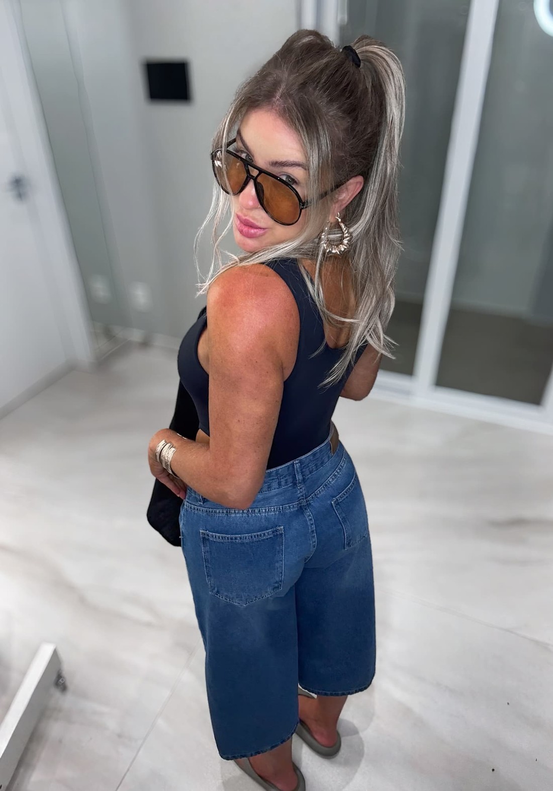 Bermuda jeans possui fechamento frontal em zíper e botão e bolsos funcionais. Uma peça super clássica, versátil e ao mesmo tempo super moderna. A tendência do jorts chegou por aqui e nós amamos!