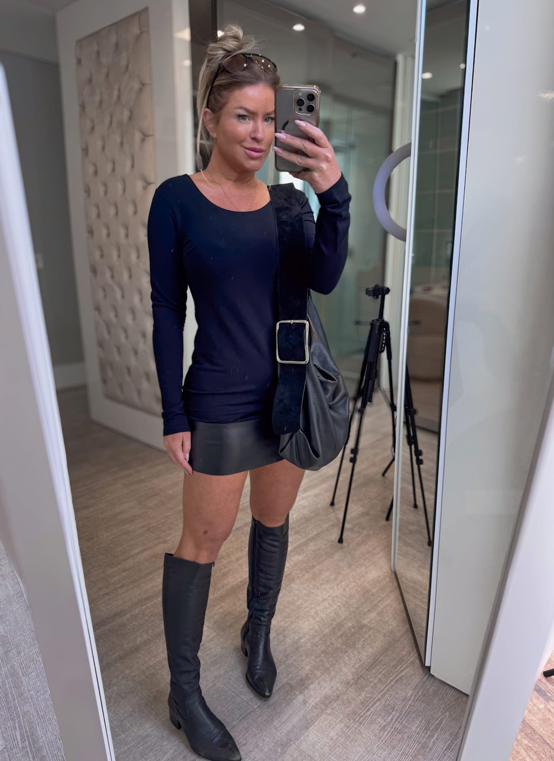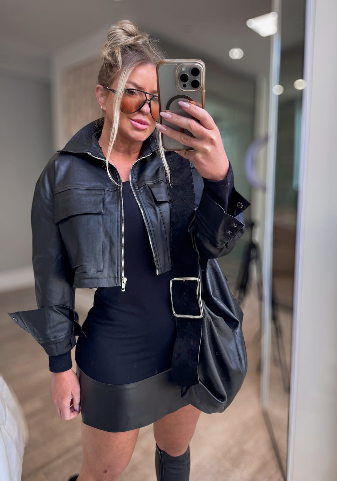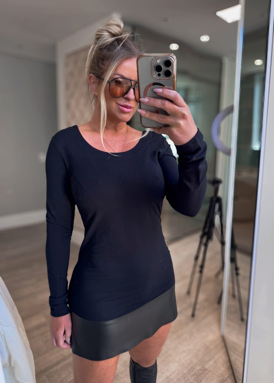 Blusa alongada manga longa, decote arredondado. com detalhe em couro na barra .Perfeita para fazer diversas composição de look, peça bem molinha super confortável.