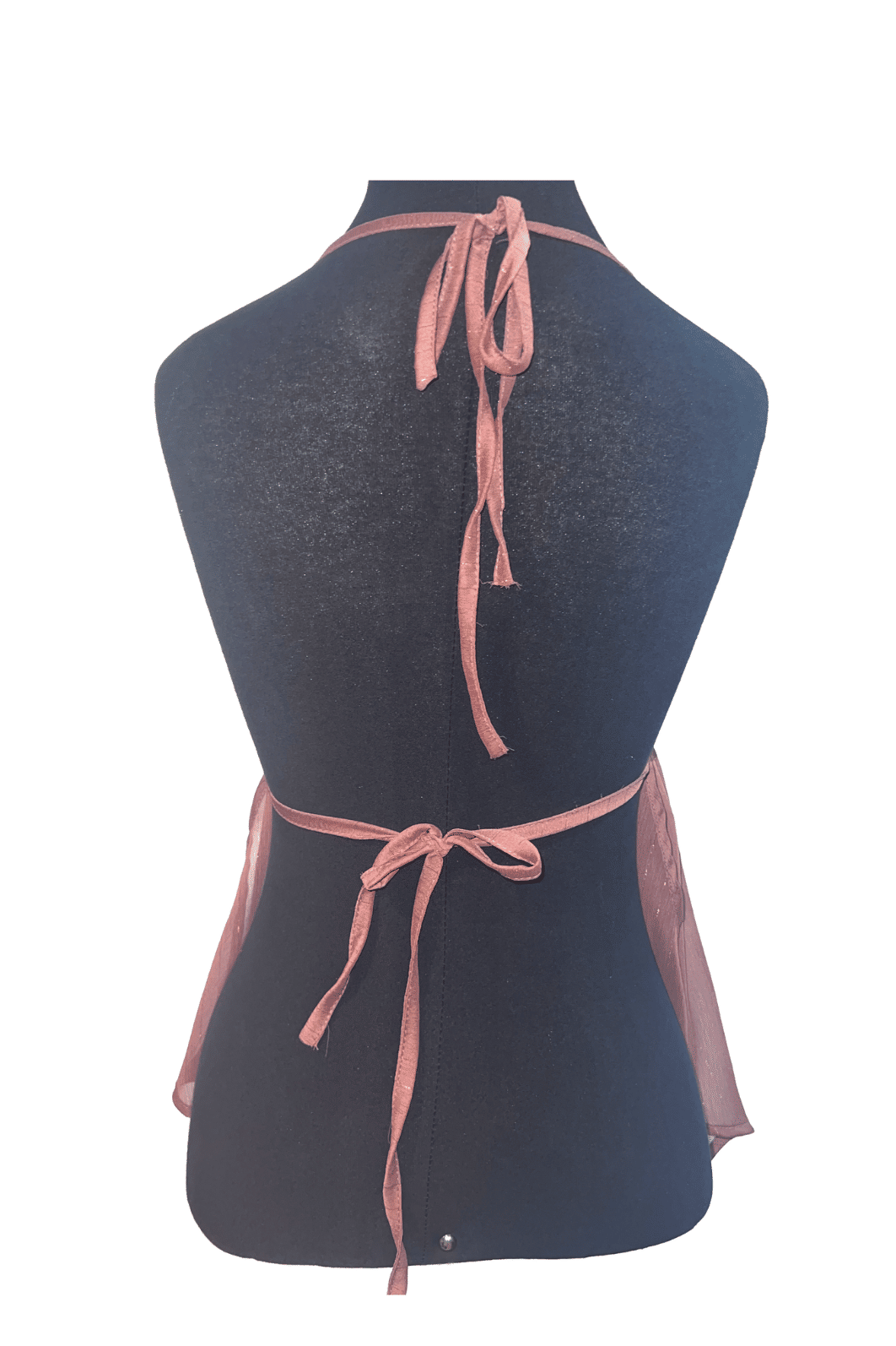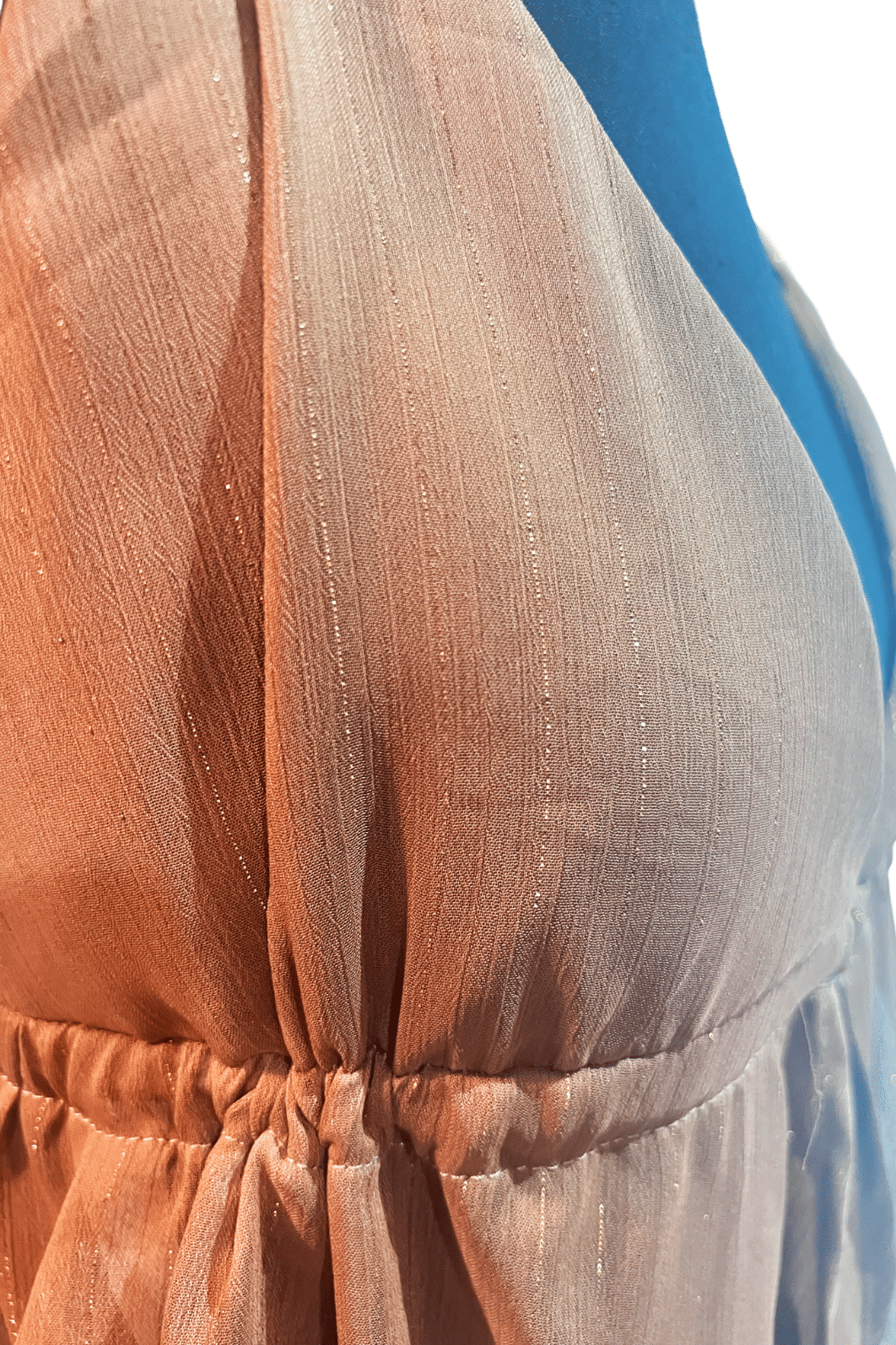 Blusa frente única em estilo romântico com toque boho e sensual. Possui amarração no pescoço e na parte frontal para melhor ajuste. Tem comprimento alongado e assimétrico, com pontas soltas e caimento esvoaçante. O tecido possuí sutis listras verticais douradas, agregando um design moderno e elegante para a blusa.