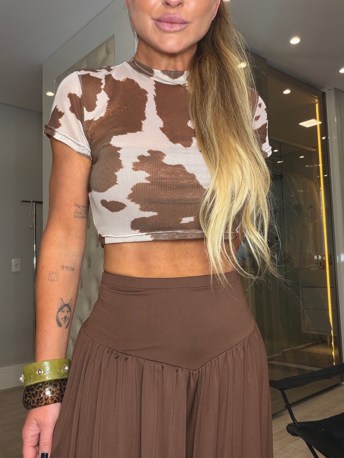 Cropped básico manga curta com decote arredondado,tecido em tule estampa de vaca ideal para fazer diversas composições sem perder o conforto
