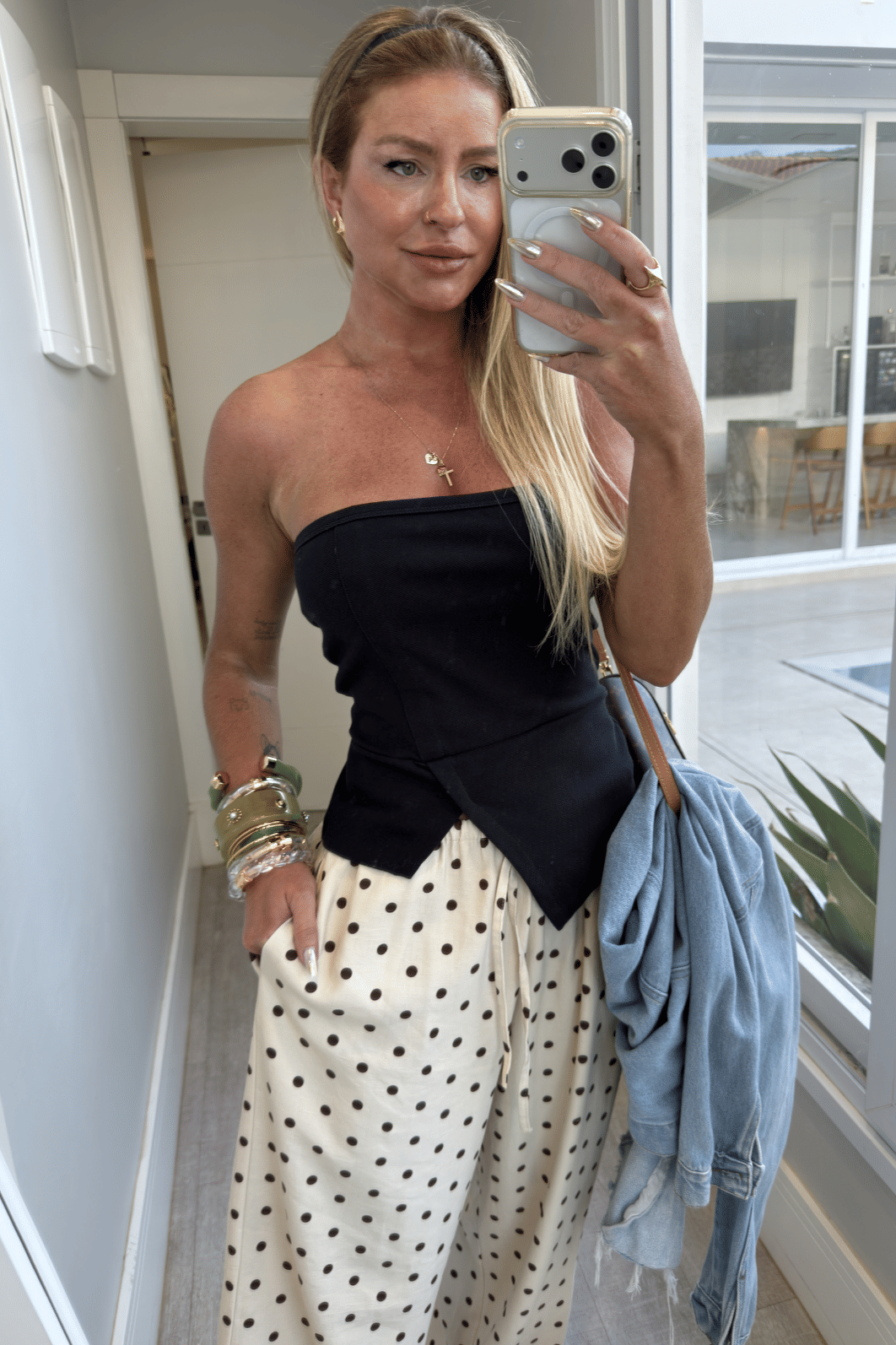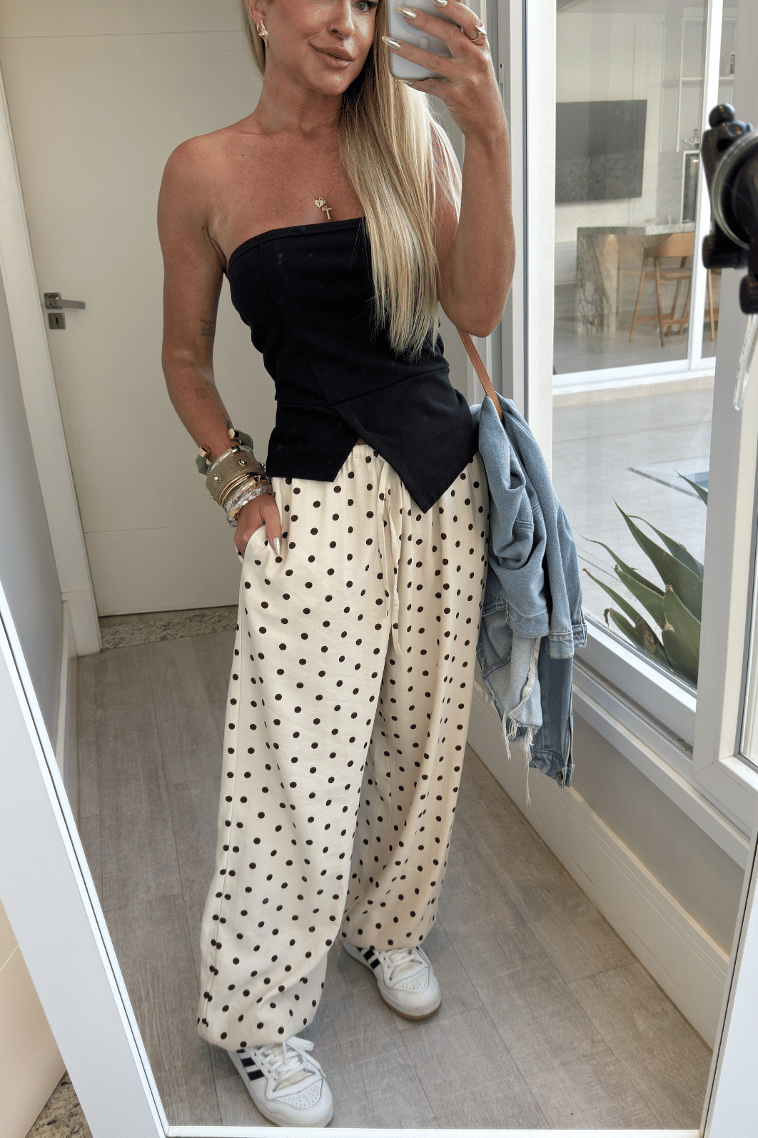 Blusa tomara que caia assimétrica preta. Ideal para combinar com looks causais e chics, criando composições, modernas, elegantes e versáteis.