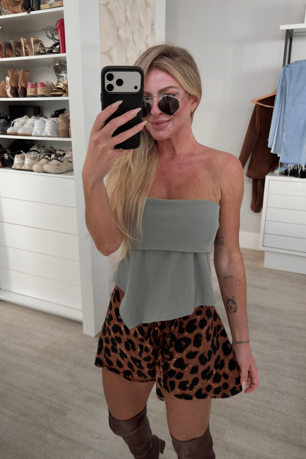 Blusa de modelagem tomara que caia confeccionada em tecido de textura canelada com barra assimétrica e sobreposição no busto.