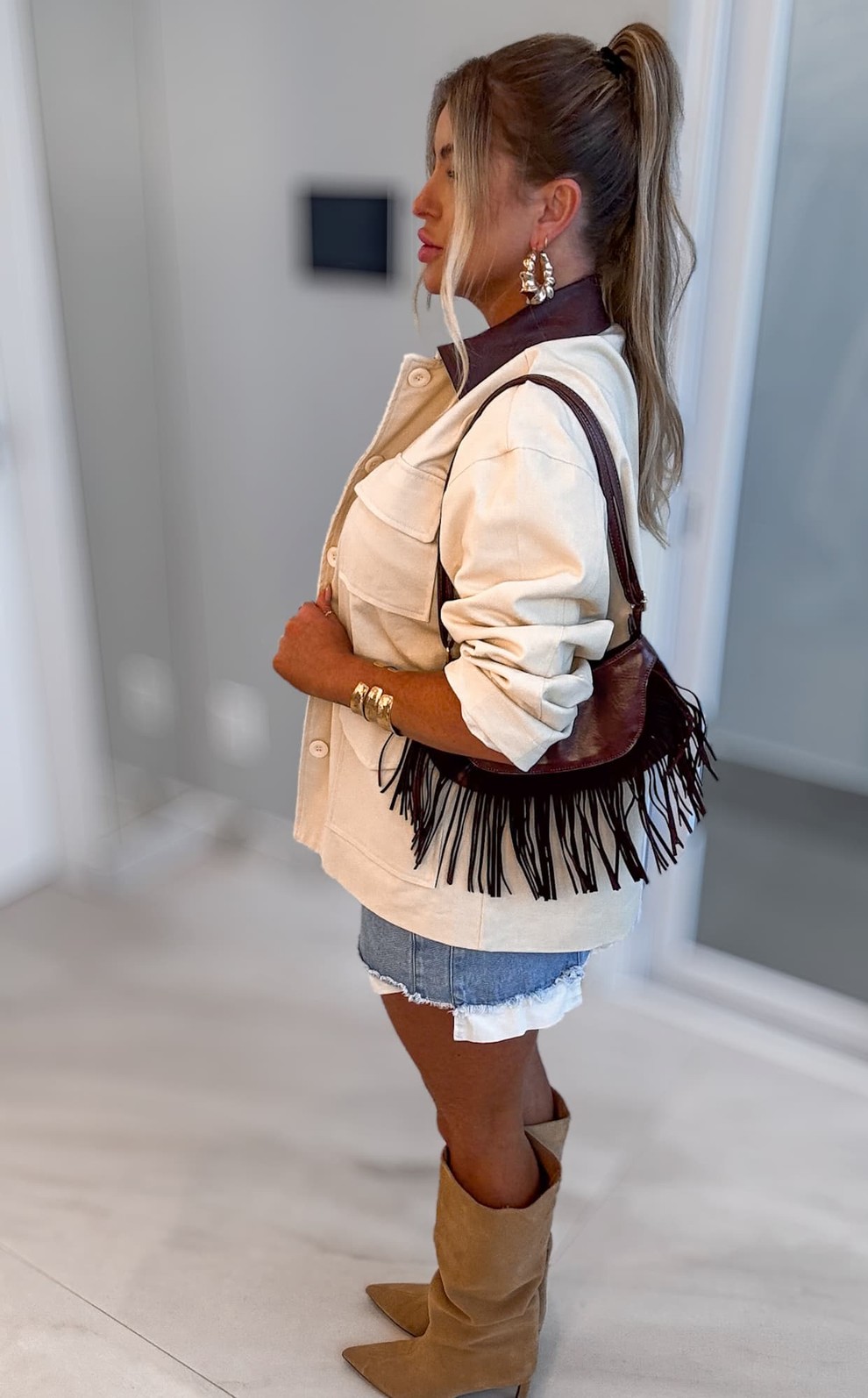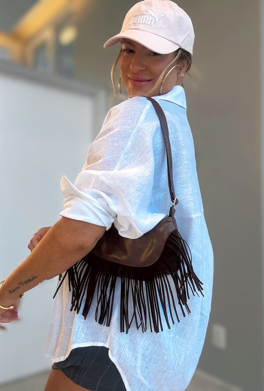 Bolsa em couro sintético com detalhe em franja possui alça regulável, fechamento em zíper. Dentro possui forro. Essa bolsa deixa seus objetos mais organizados e proporciona um ar mais despojado ao look.