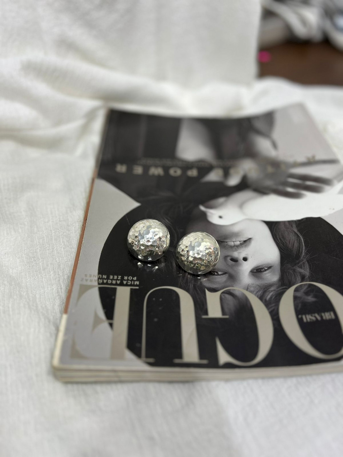 Brinco estilo redondo com textura amassadinha, seu peso é leve e não machuca a orelha. Possui fecho tipo sutiã de orelha.