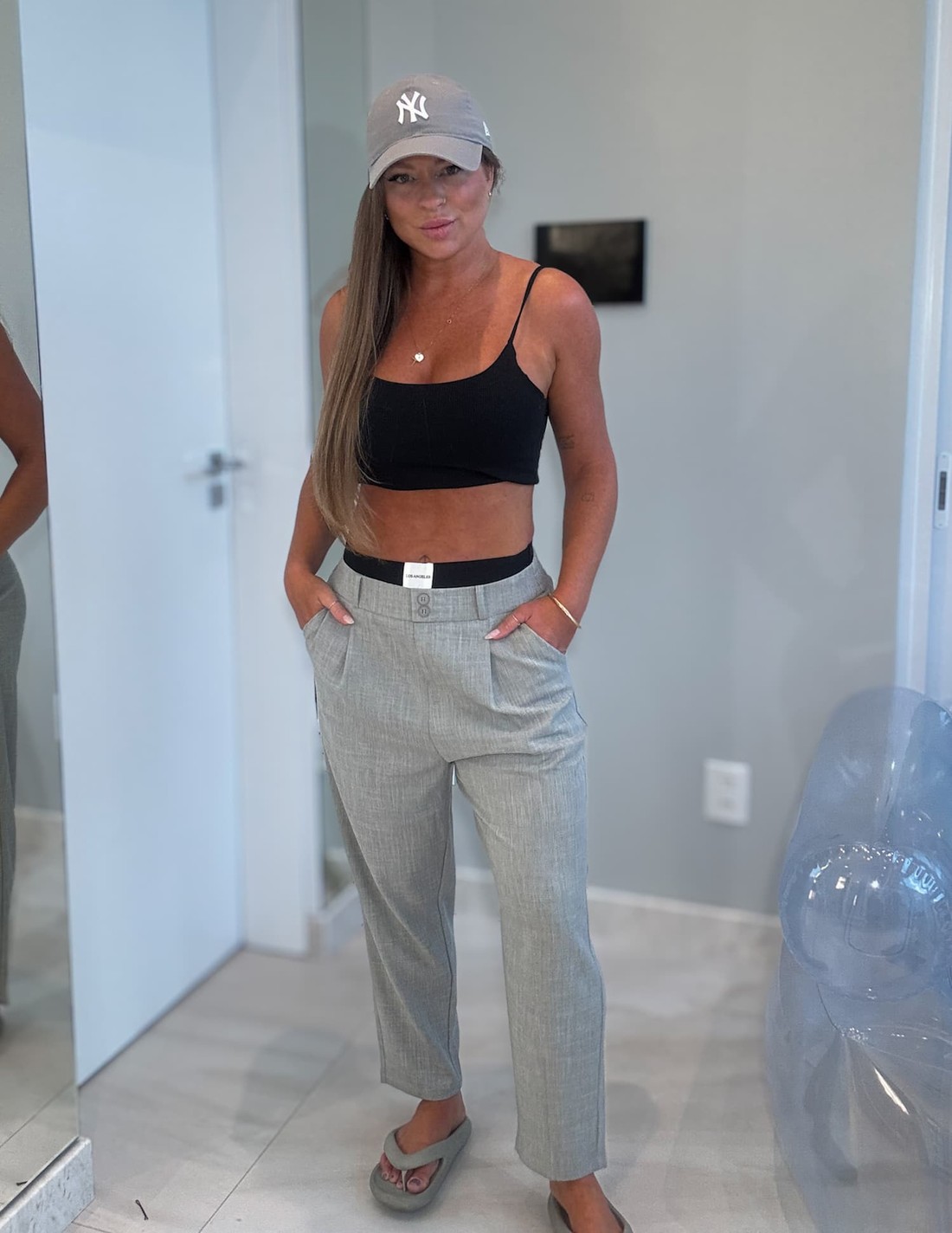 Calça de alfaiataria possui elástico na parte de trás com botões na parte da frente, detalhes de bolso faca funcionais. Possui preguinhas na parte da frente como detalhe. A calça de alfaiataria é uma peça clássica e atemporal, que nunca sai de moda.