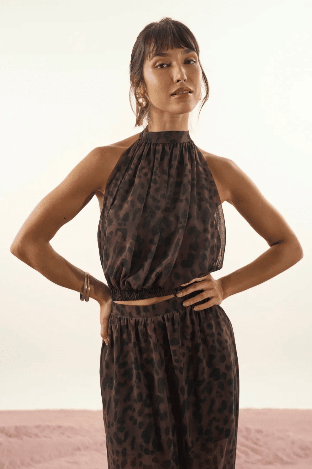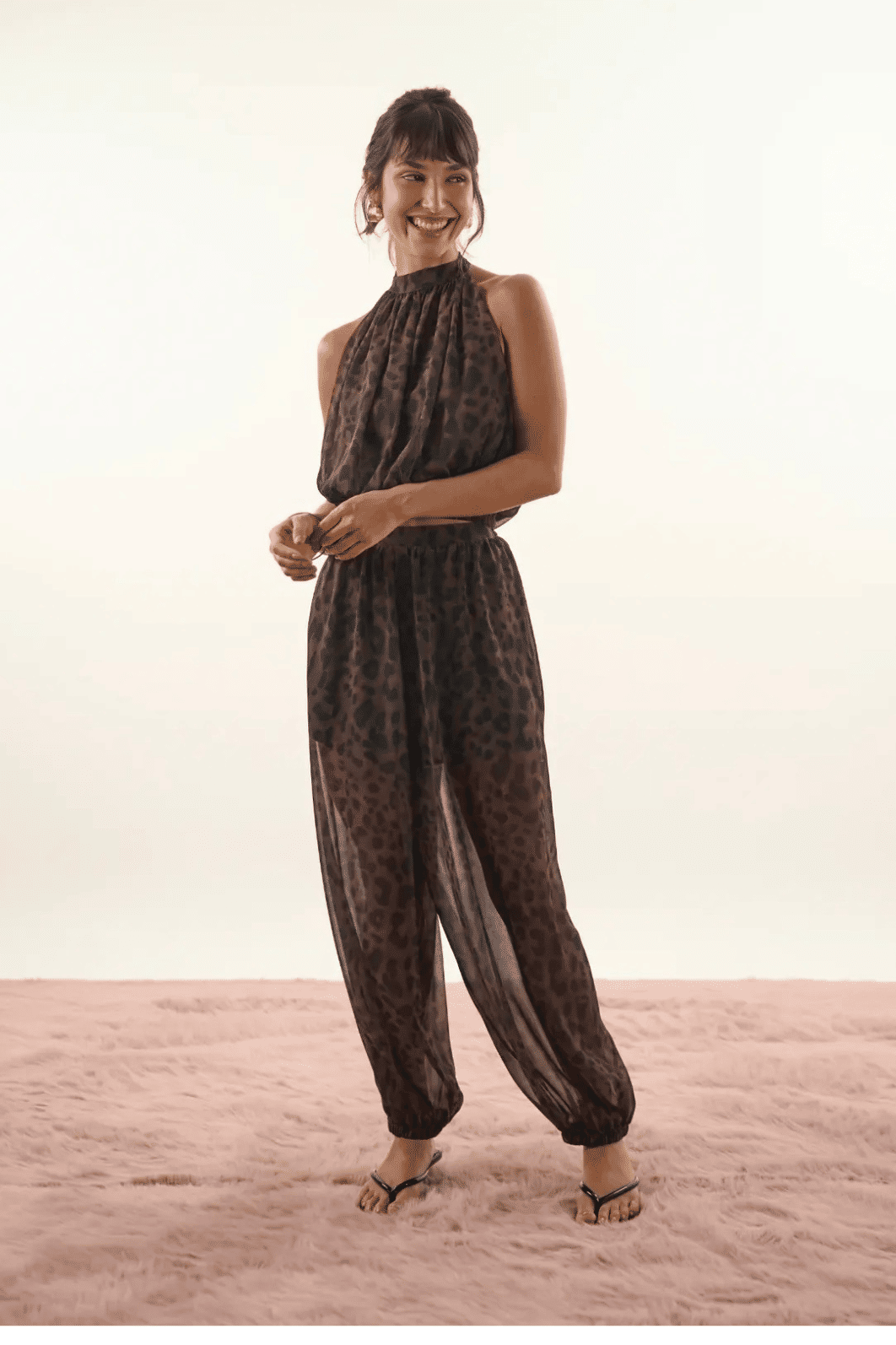 Calça super estilosa e confortável. Em tecido de tule estampado de oncinha com transparência, tendo forro preto . Elástico embutido no cós e na barra