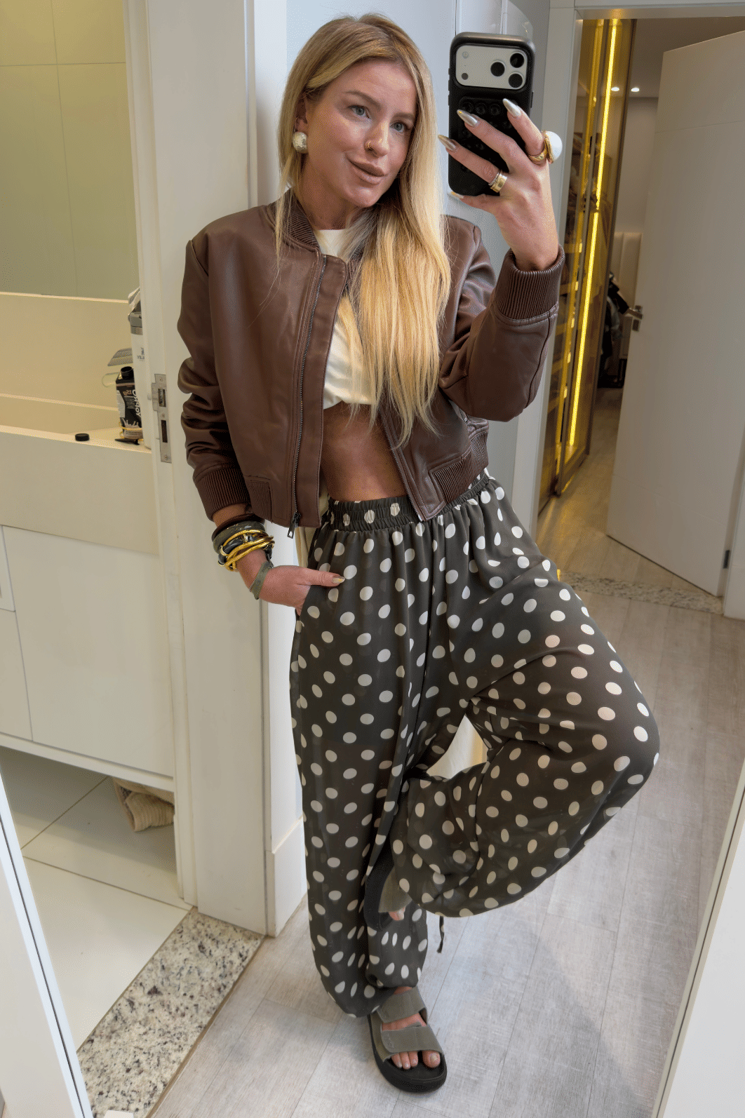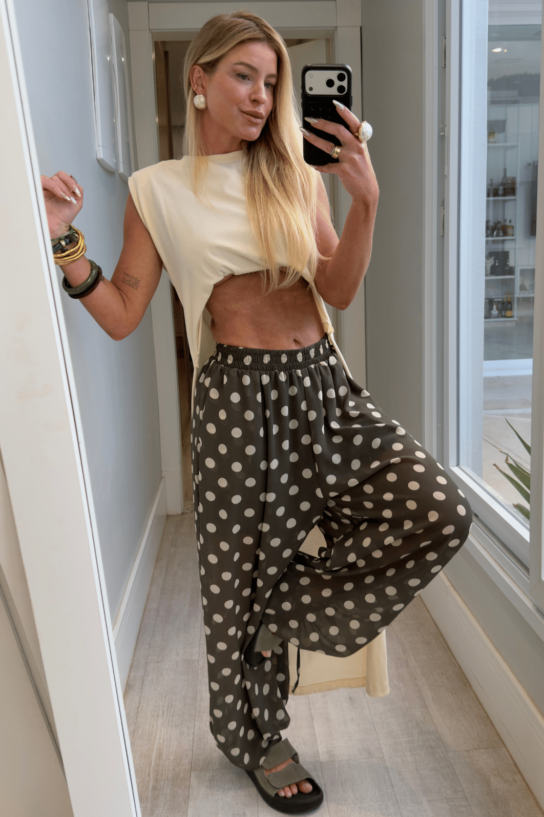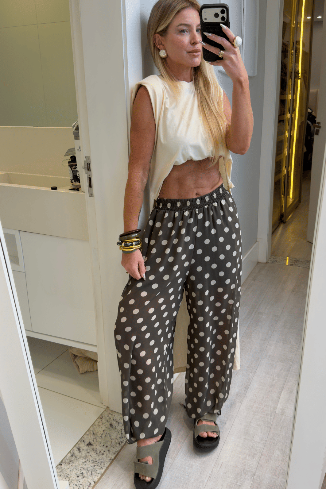 Calça super estilosa e confortável ,tecido em microtule, estampa de poá, Elástico embutido no cós e na barrapara melhor ajuste . modelagem balloon mais ampla