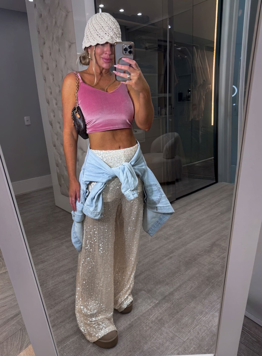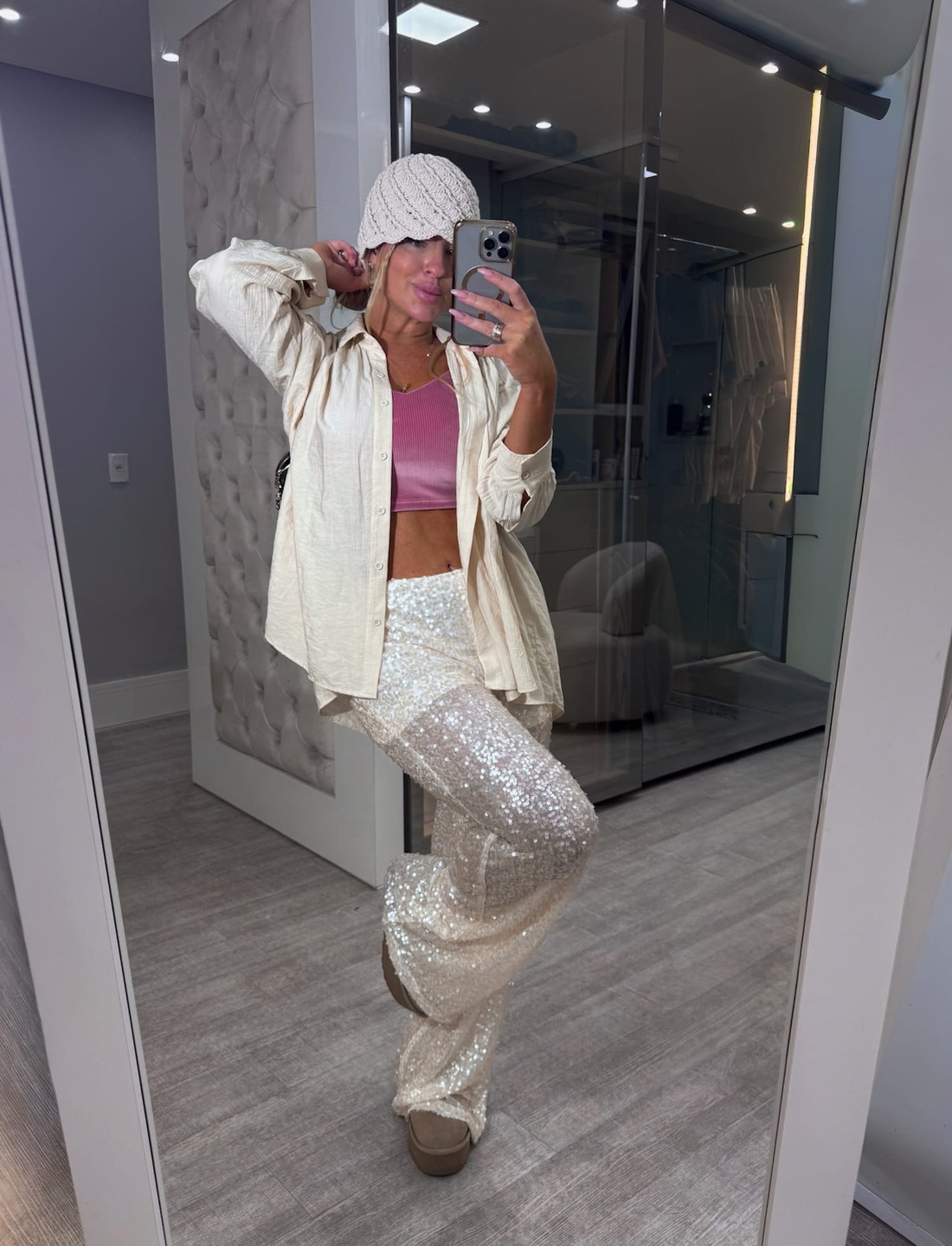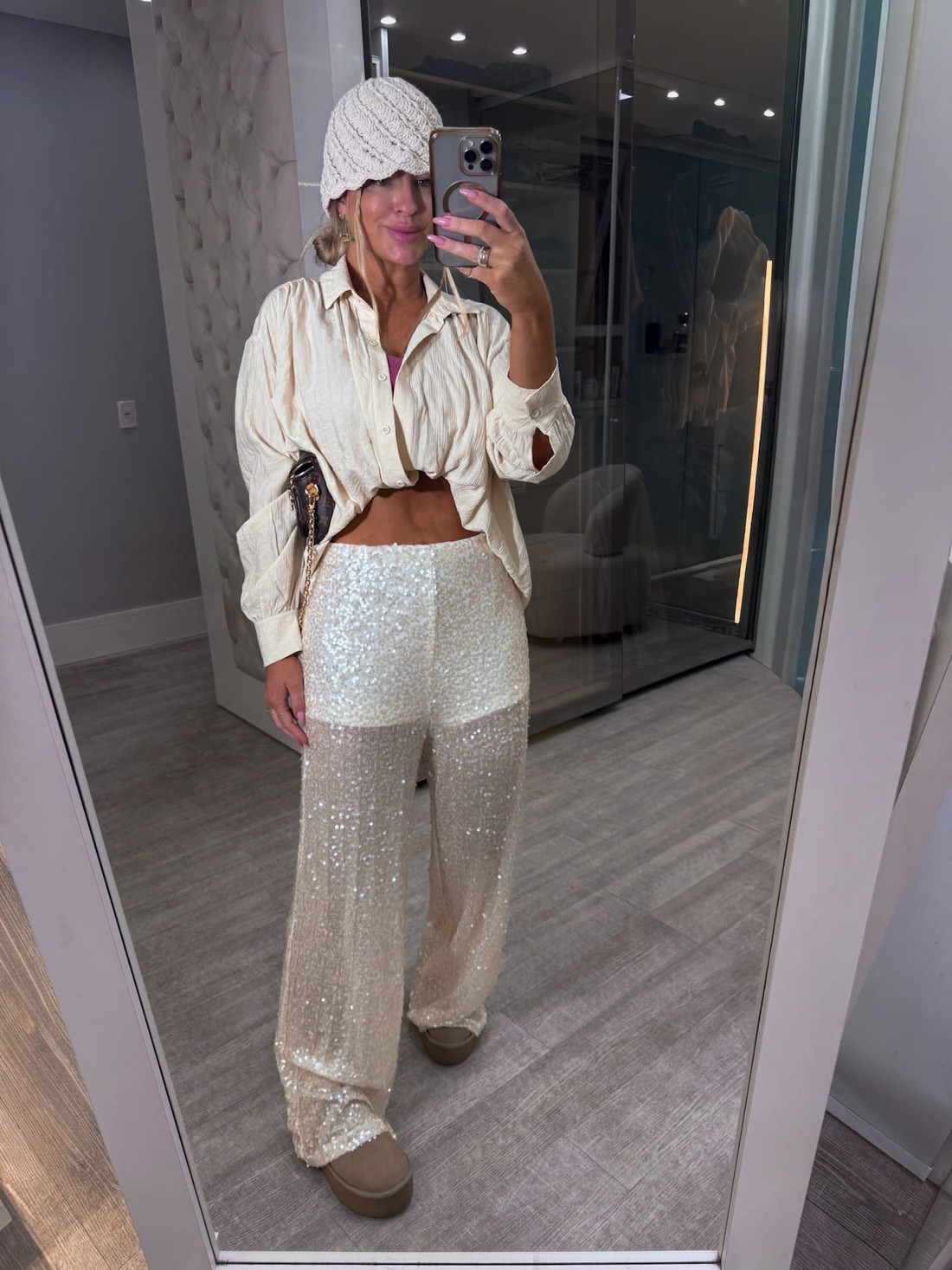 Calça de tule com aplicações de paetê possui fechamento na lateral em paetê e linda transparência deixando a peça ainda mais elegante. Possui brilho e aplicações de paetê que deixam a peça ainda mais única.