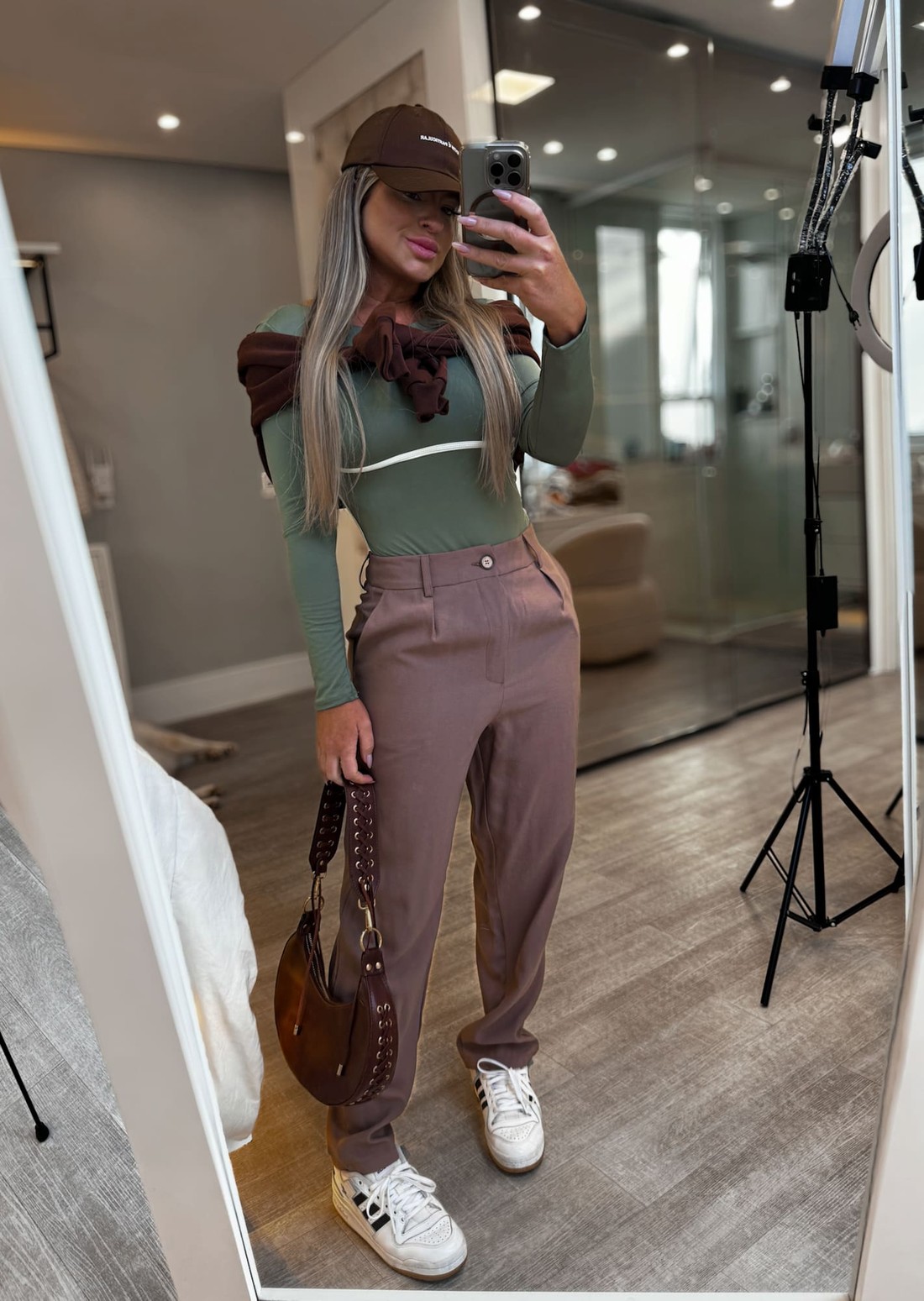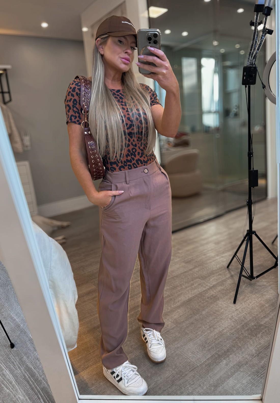 Calça em alfaiataria possui fechamento frontal em zíper e botão e bolsos faca funcionais. Peça versátil podendo ser usada facilmente em diferentes estilos e composições, proporcionando estilo e elegância.