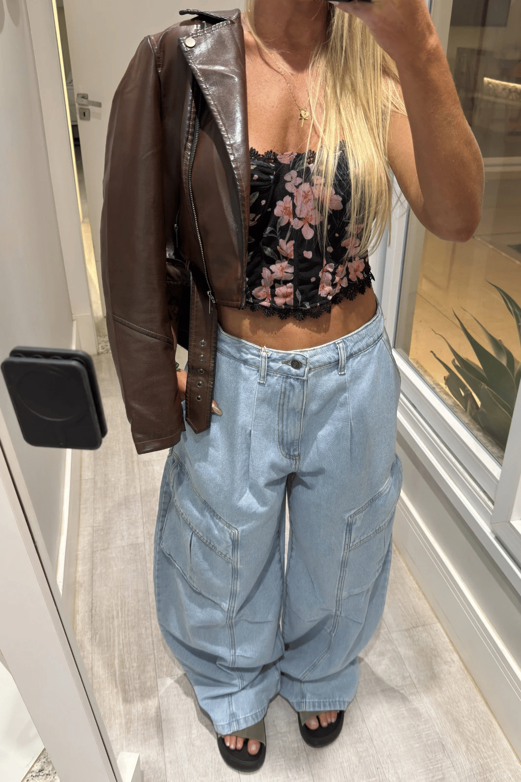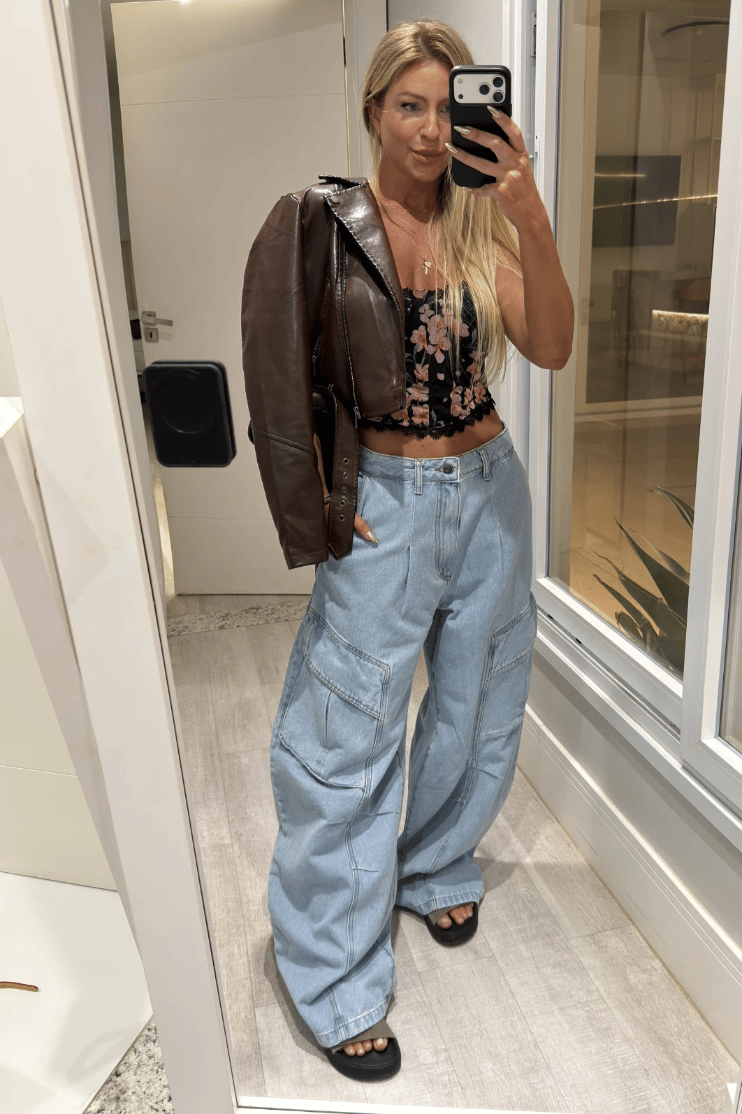 Calça jeans ballon cargo possui fechamento frontal em zíper e botão e bolsos funcionais, . modelagem mais ampla que da todo um charme pra peça. Peça atemporal para quem gosta de algo mais despojado.