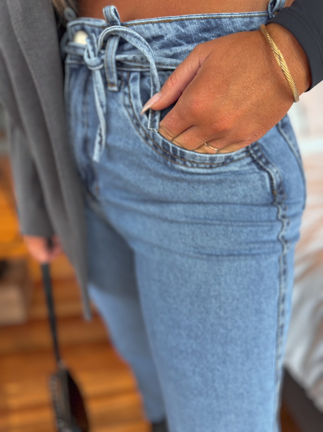 Calça jeans com modelagem clochard possui bolsos funcionais e cordão de amarração opcional e barra dobrada. Peça versátil e estilosa, essencial no seu guarda roupa.