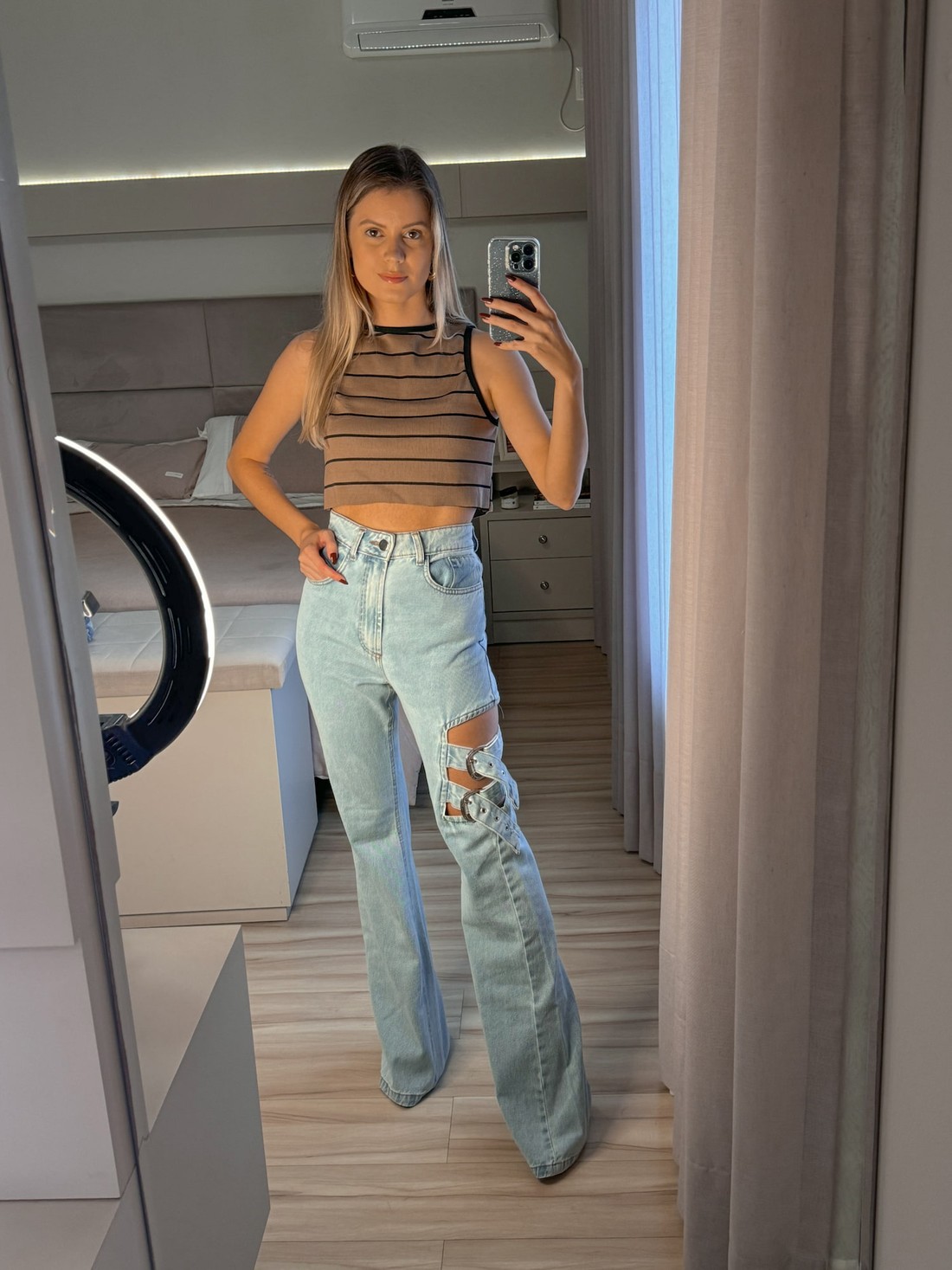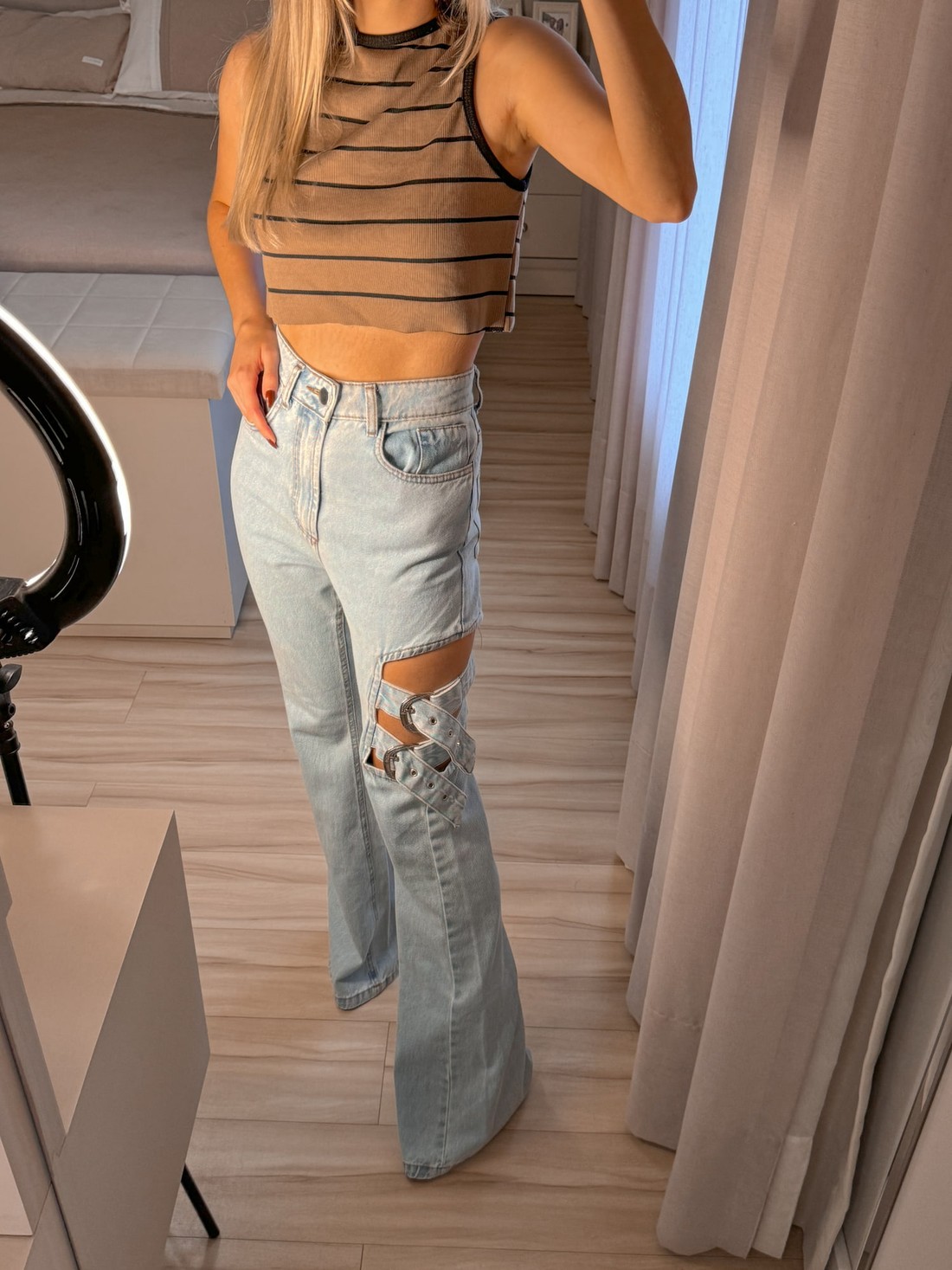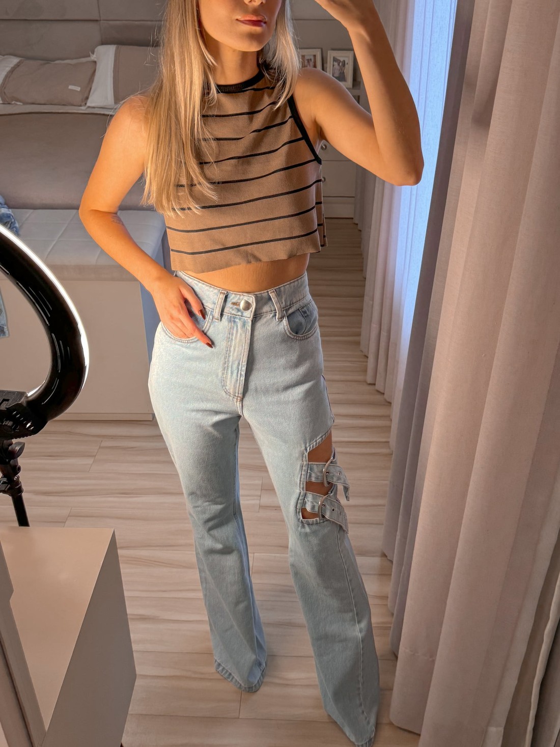 Calça jeans com modelagem wide leg possui fivelas na lateral com recortes, com fechamento frontal em zíper e botão e bolsos funcionais. Peça estilosa e atemporal, um arraso!