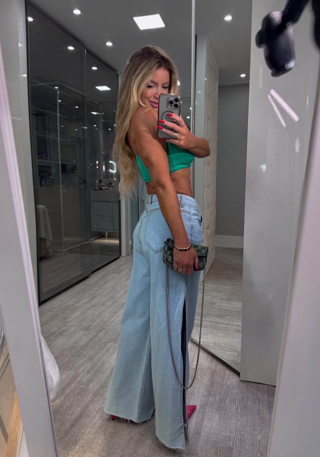 Calça jeans pantalona com fenda lateral possui fechamento frontal em zíper e botão e bolsos funcionais. Peça super atemporal e moderna para arrasar em suas composições.
