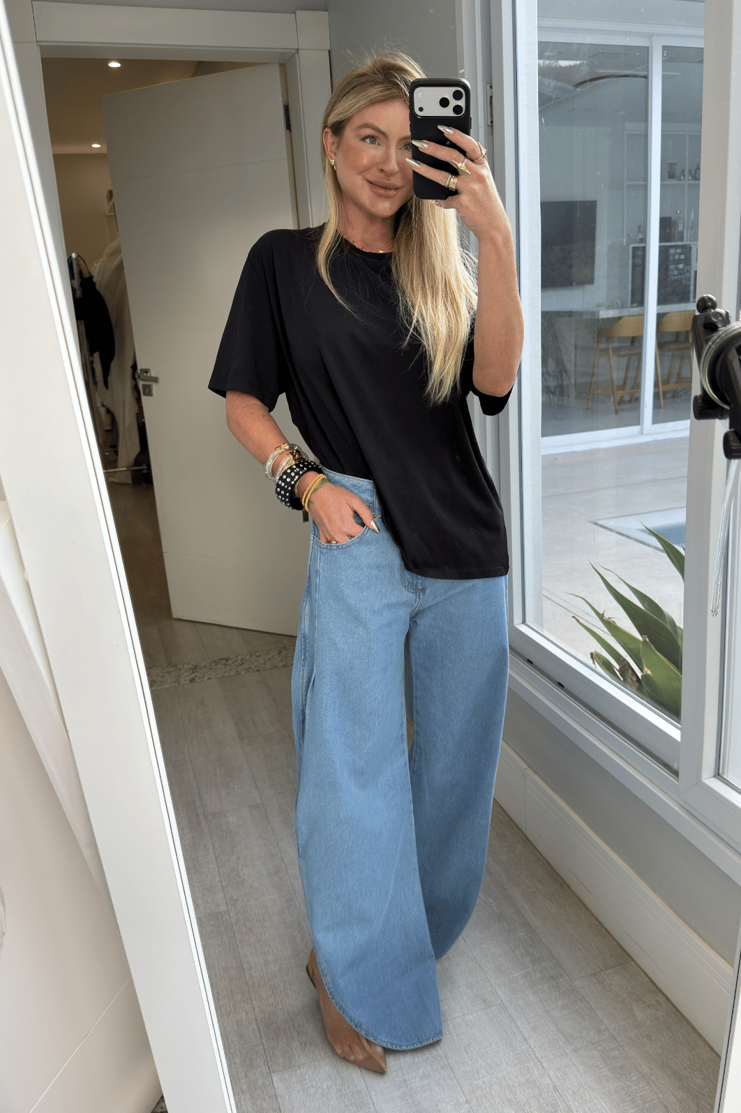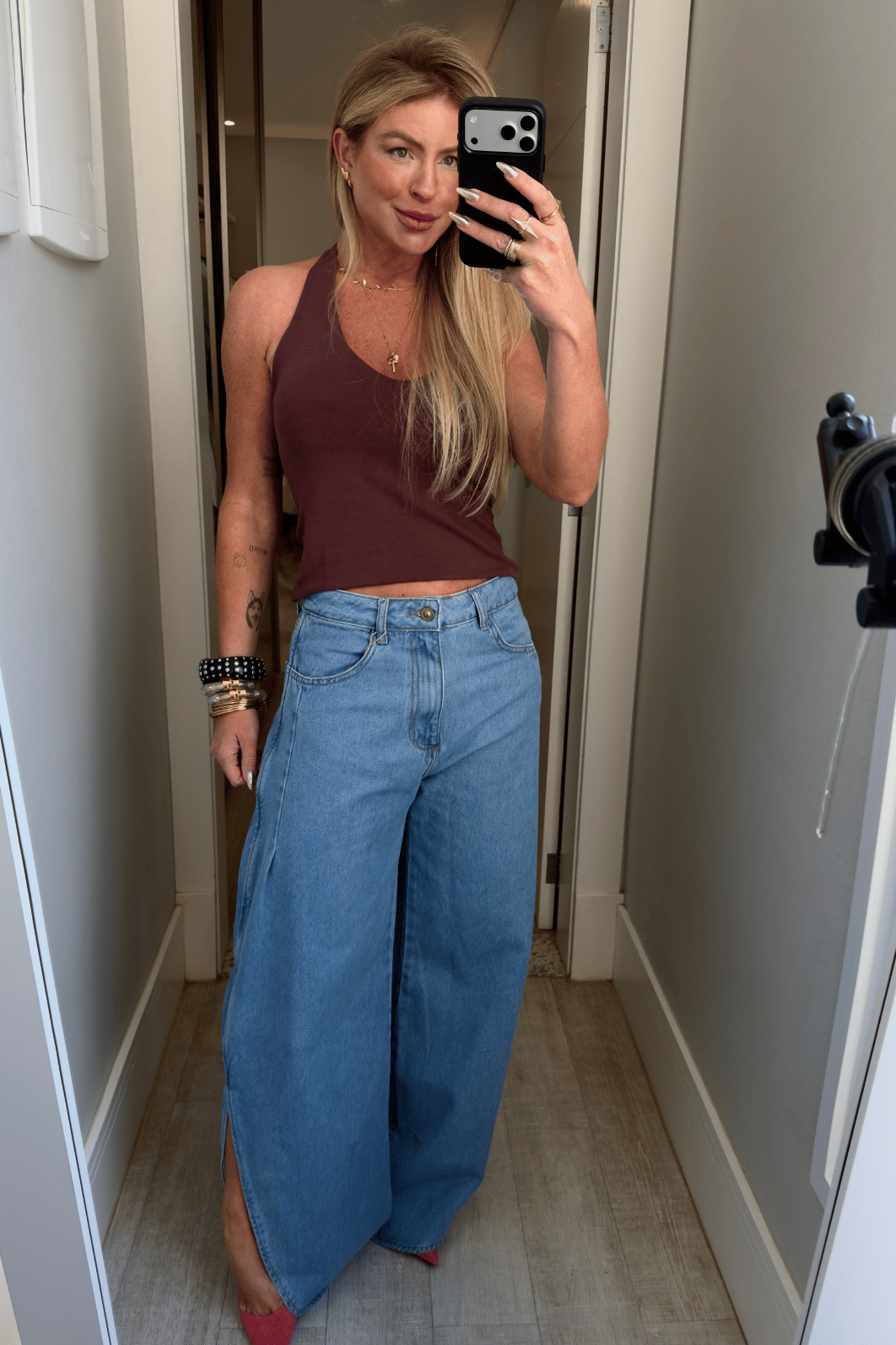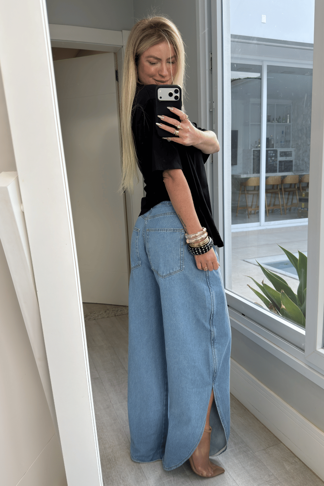 Calça jeans pantalona com fenda lateral possui fechamento frontal em zíper e botão e bolsos funcionais. A Pantalona Ruby é daquelas peças que