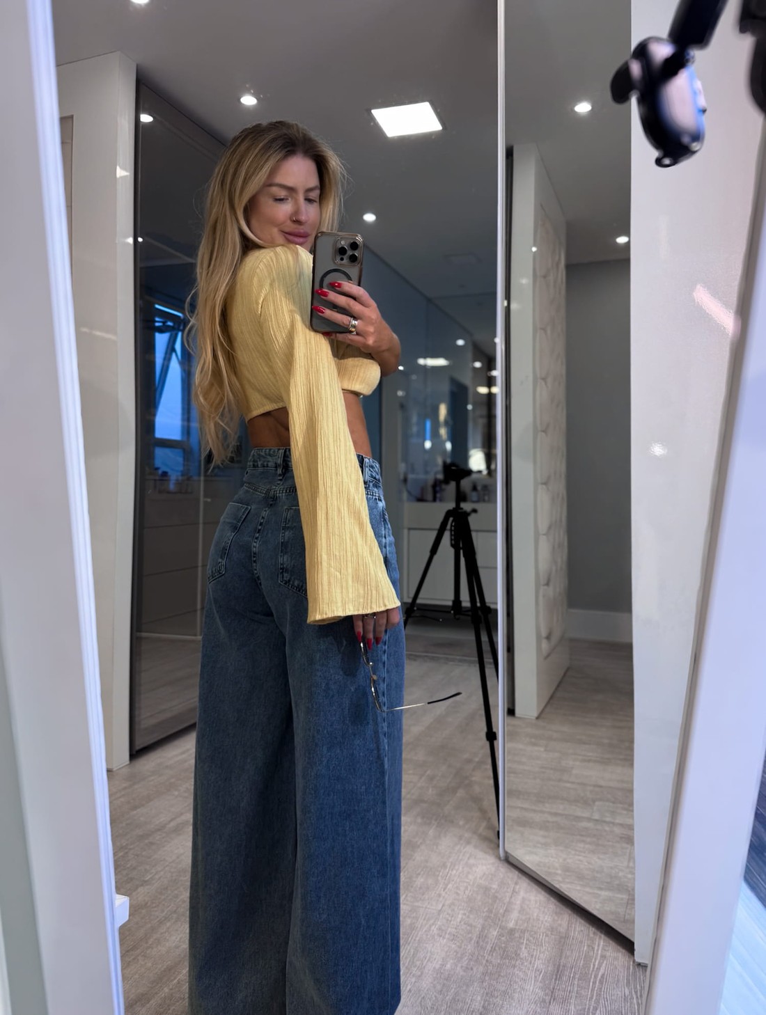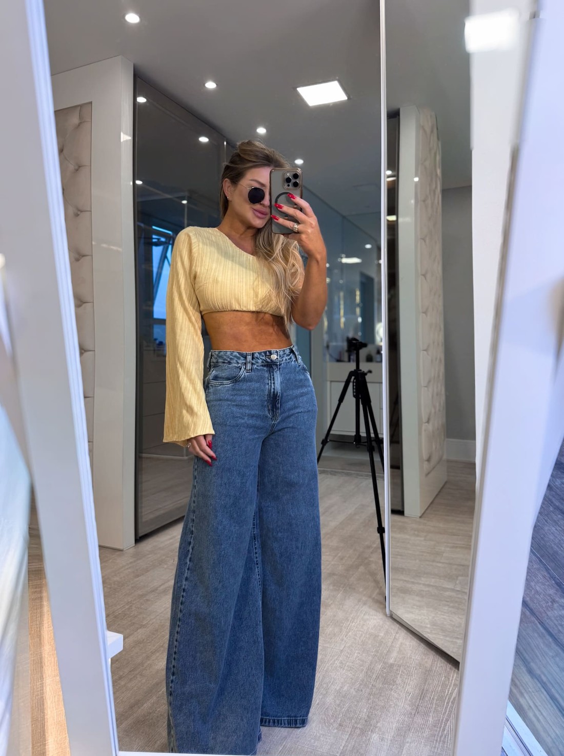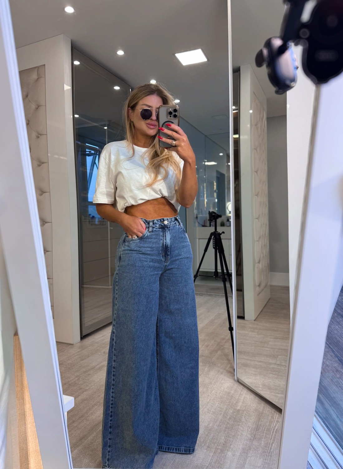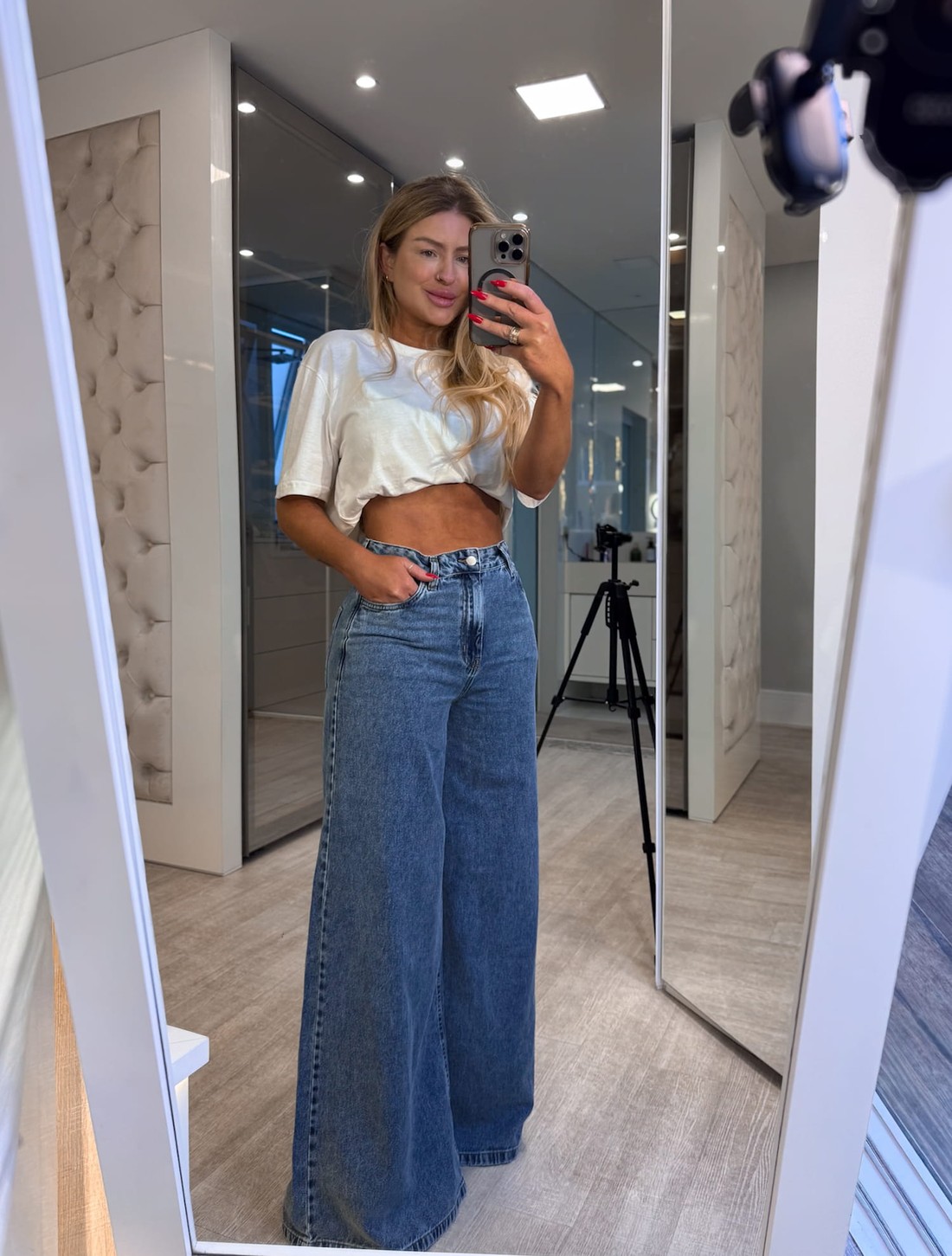 Calça jeans pantalona possui fechamento frontal em zíper e botão e modelagem mais ampla dando todo um charme pra peça. Peça única e estilosa para compor seus looks e arrasar!