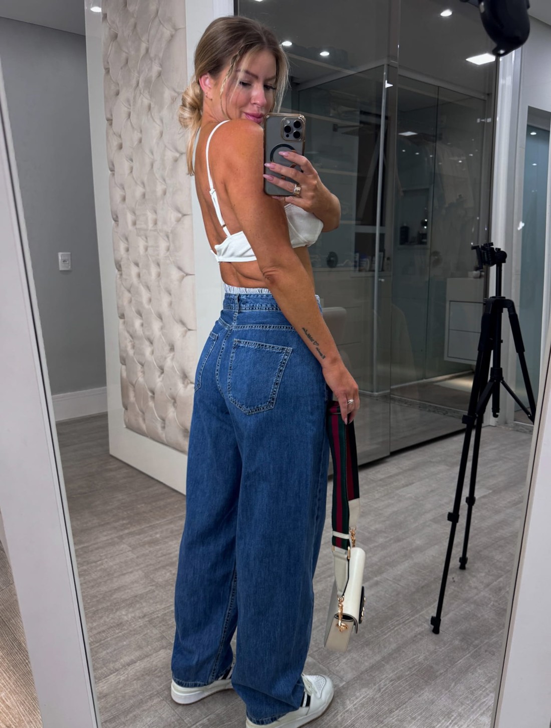 Calça jeans com modelagem reta, bolsos funcionais na frente e atrás e fechamento em zíper e botão na parte da frente. peça chave para montar diversos look.
