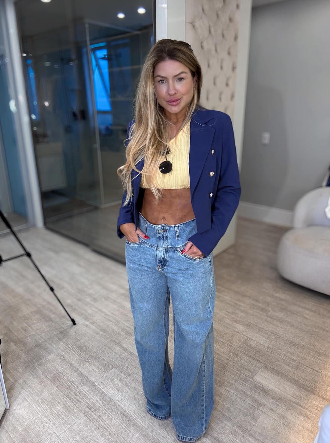 Calça jeans com modelagem wid leg , bolsos funcionais na frente e atrás e fechamento em zíper e botão na parte da frente. com detalhes em costura no cós que da rodo um charme pra peça .Peça única e estilosa.