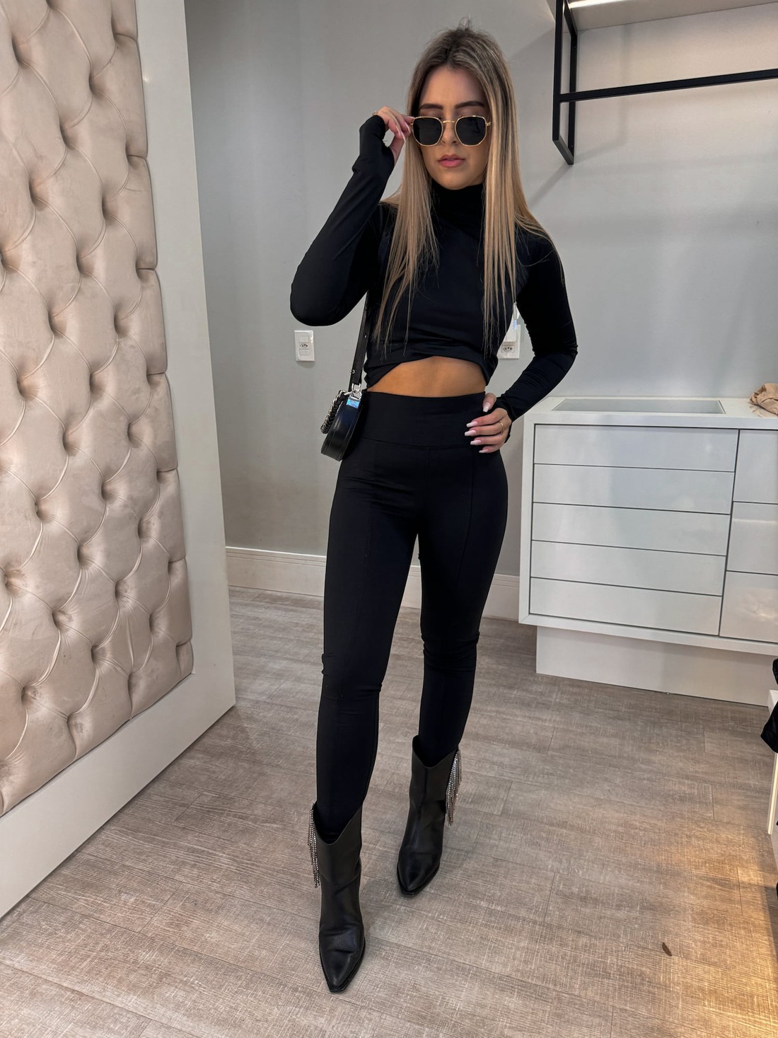 Confeccionada em tecido com elastano, a calça legging modela a silhoueta se ajustando o corpo de modo confortável.