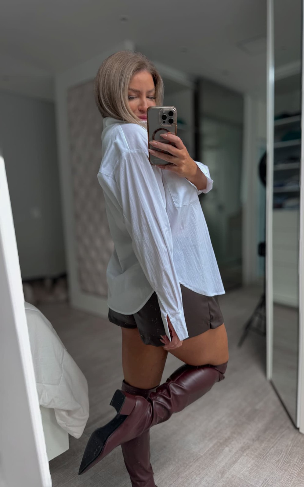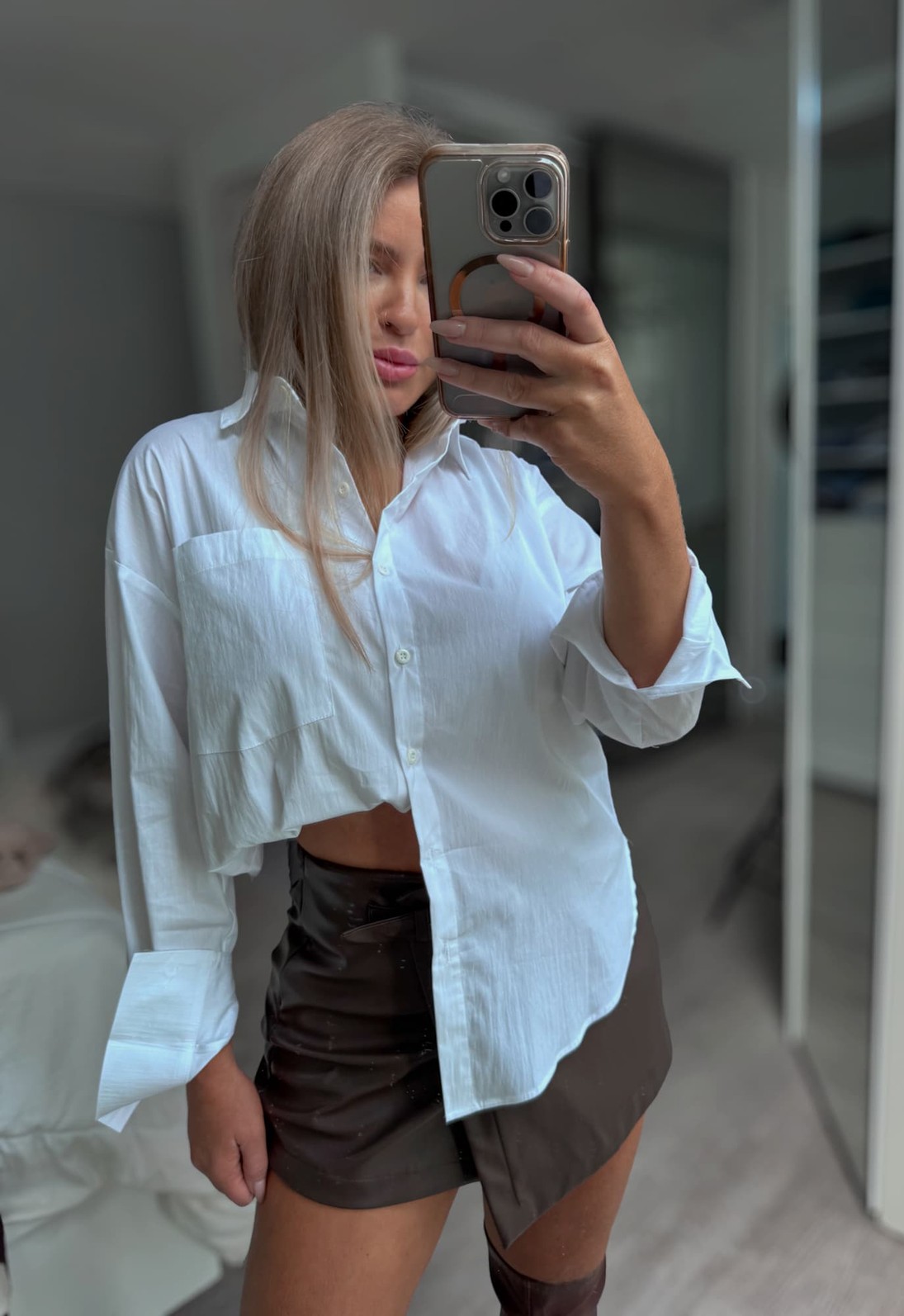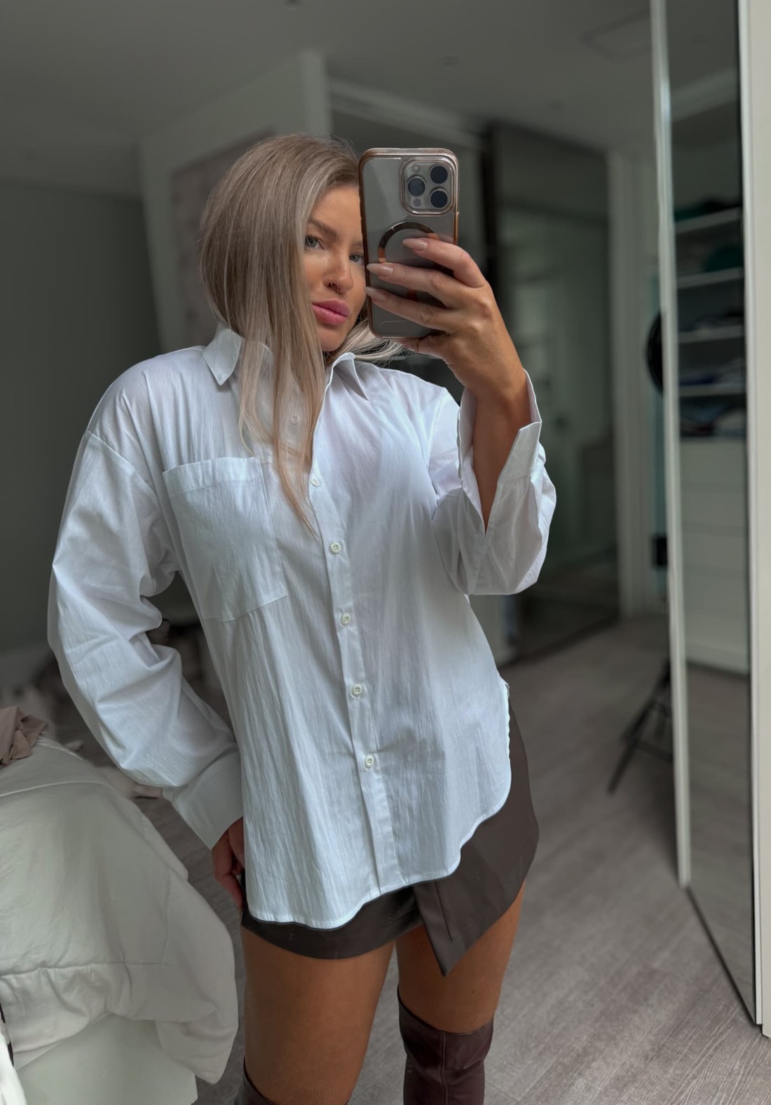 A camisa possui modelagem ampla e alongada permitindo várias combinações e sobreposições, possui fechamento em botões na parte da frente e no punho e bolso funcional, uma peça chave para se ter no guarda-roupa e compor diversos looks.