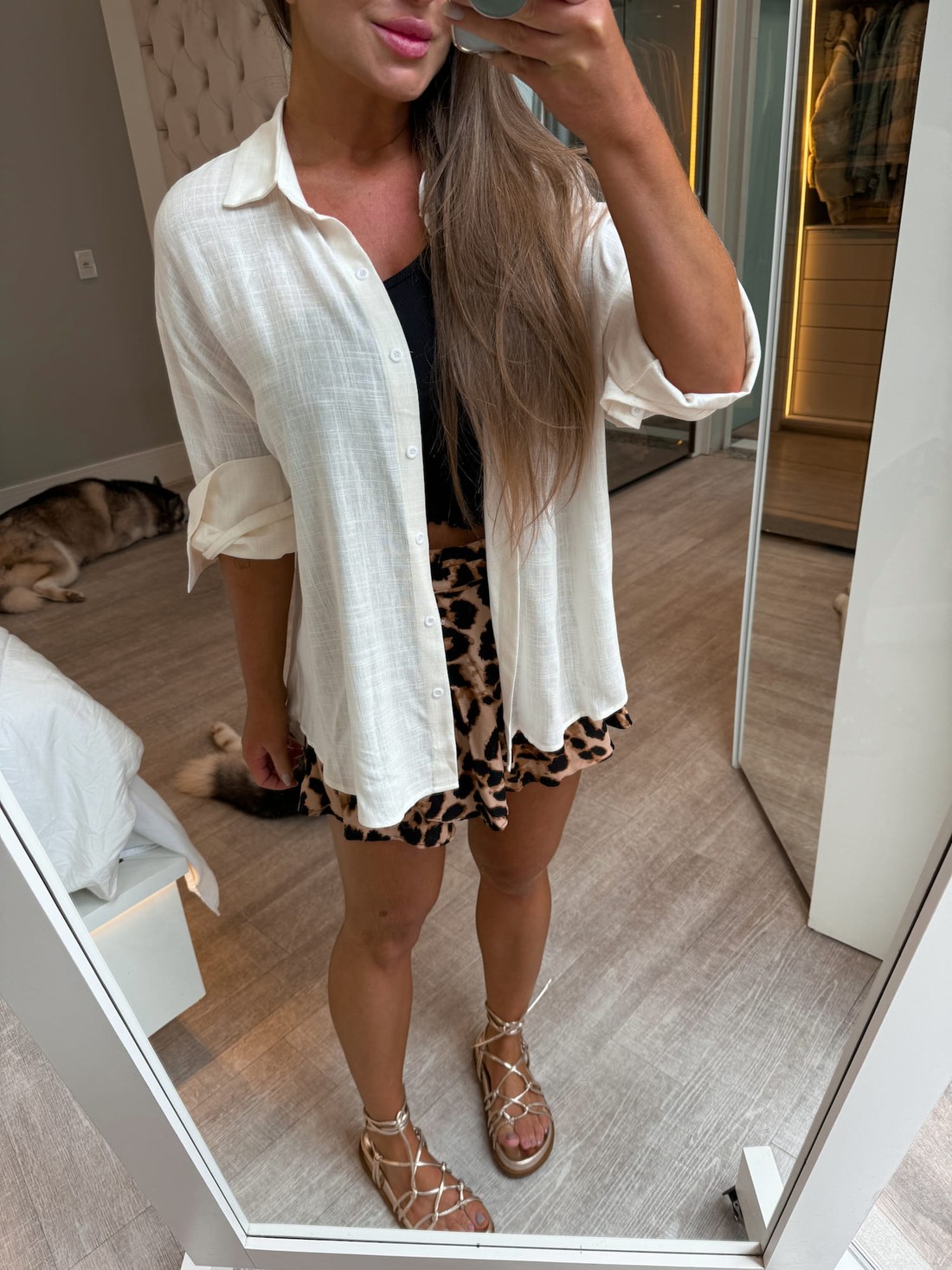 Camisa com comprimento alongado e arredondada na barra. Possui modelagem ampla permitindo várias combinações e sobreposições, possui abertura frontal com fechamento por botões e punho.