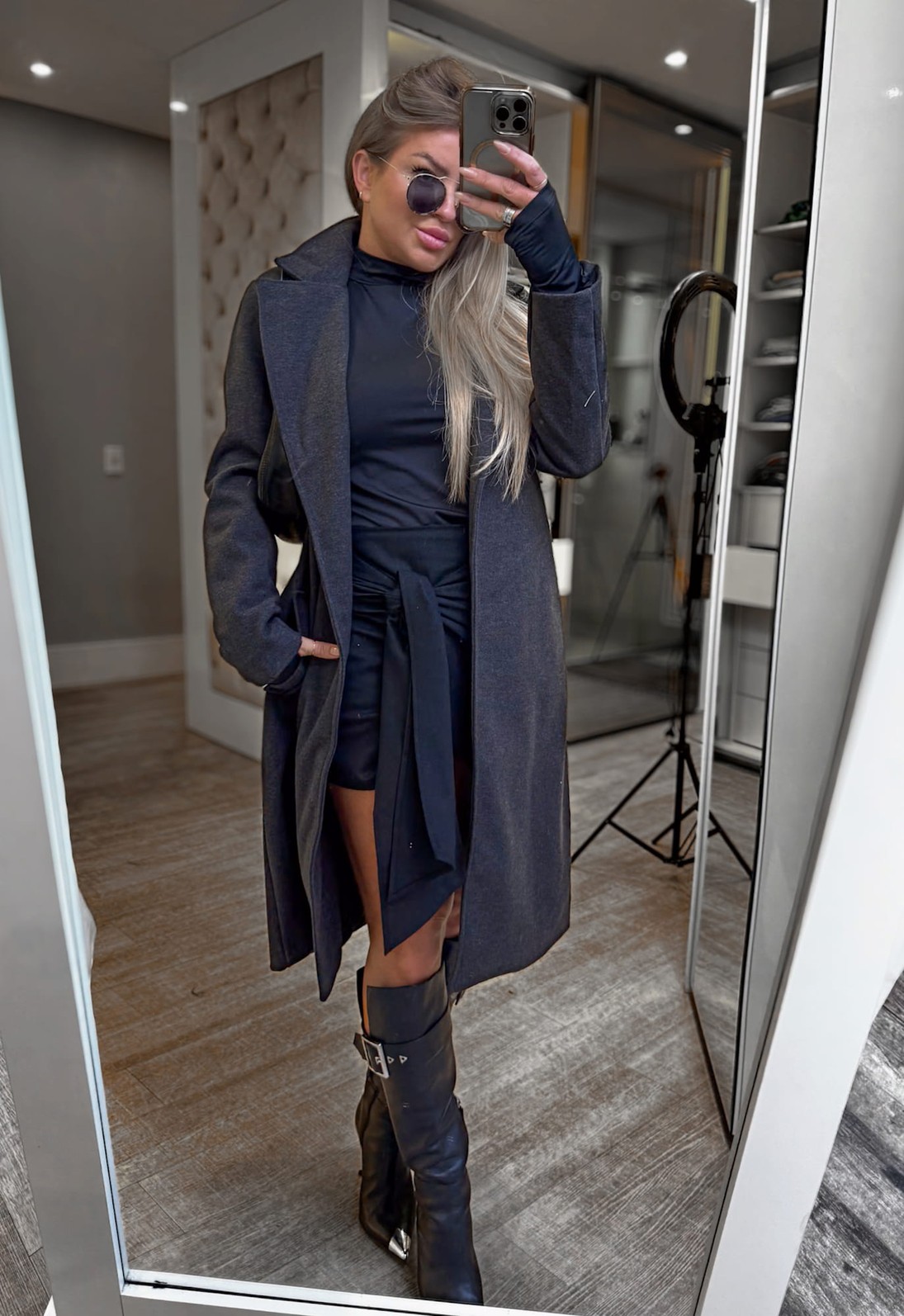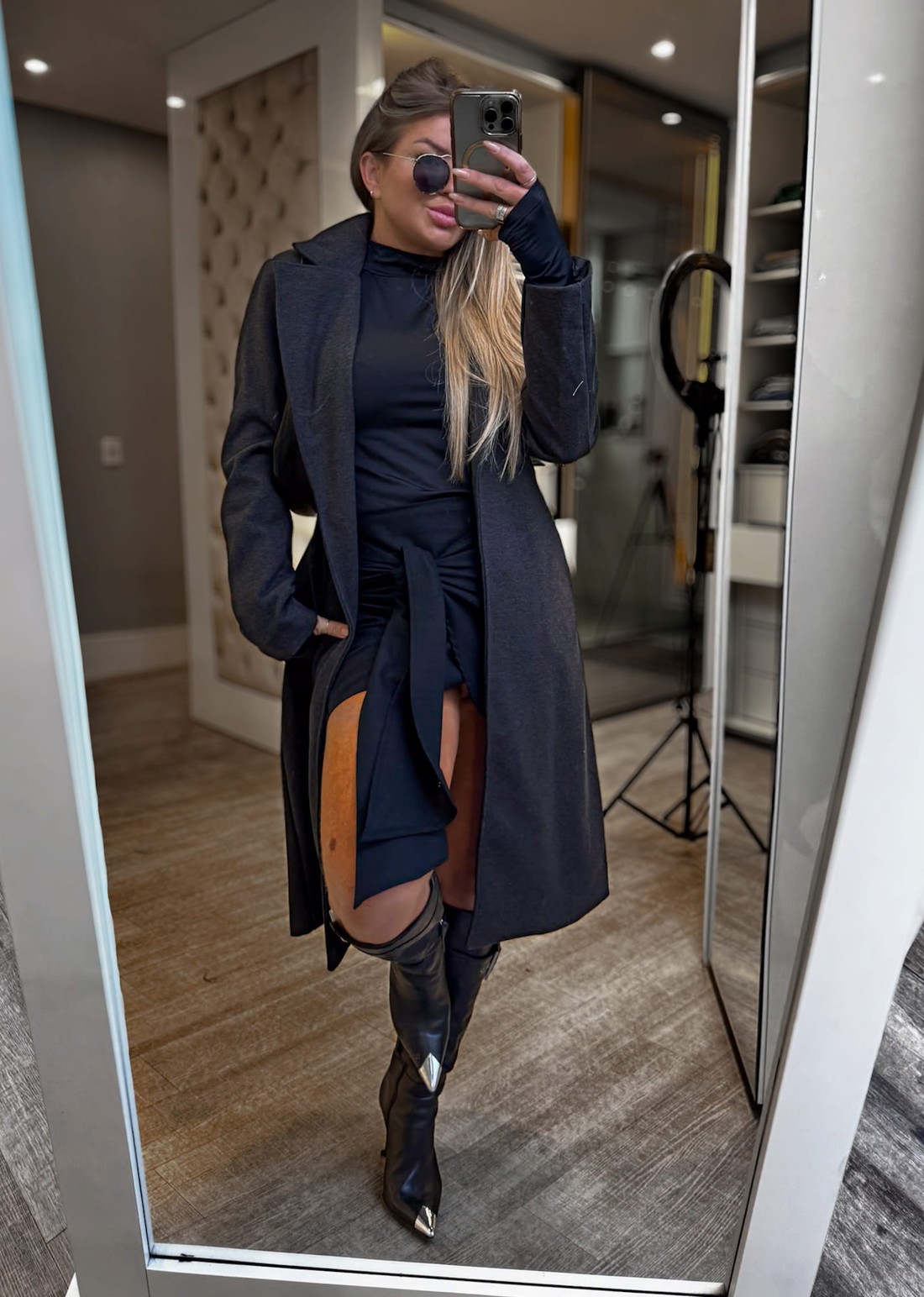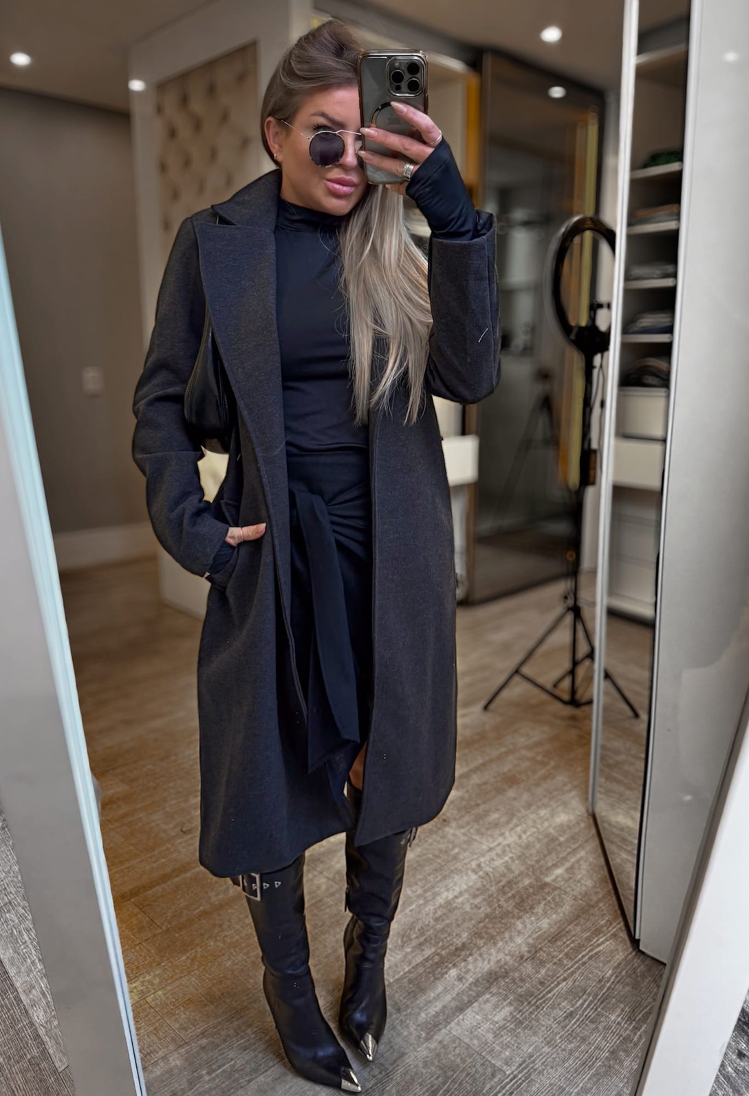 Sobretudo com gola. Com comprimento maxi alonga ainda mais a silhueta. Uma peça versátil para ser usada em looks com sobreposições.