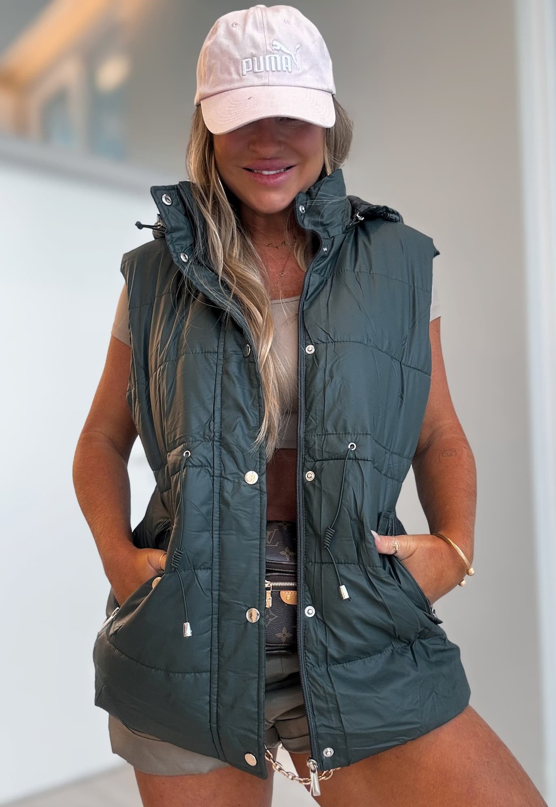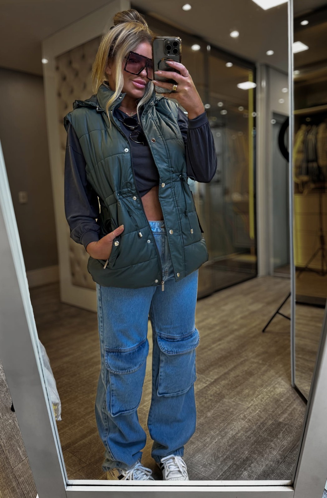 Colete confeccionado em tactel possui fechamento frontal em zíper e botão, ajuste em amarração na cintura, bolsos funcionais e capuz removível. Peça ideal para ser usada como terceira peça em dias mais frios.