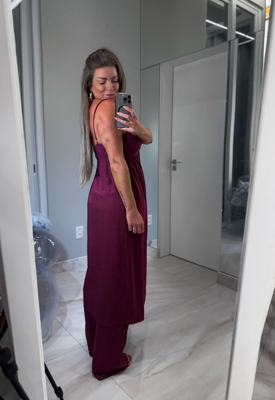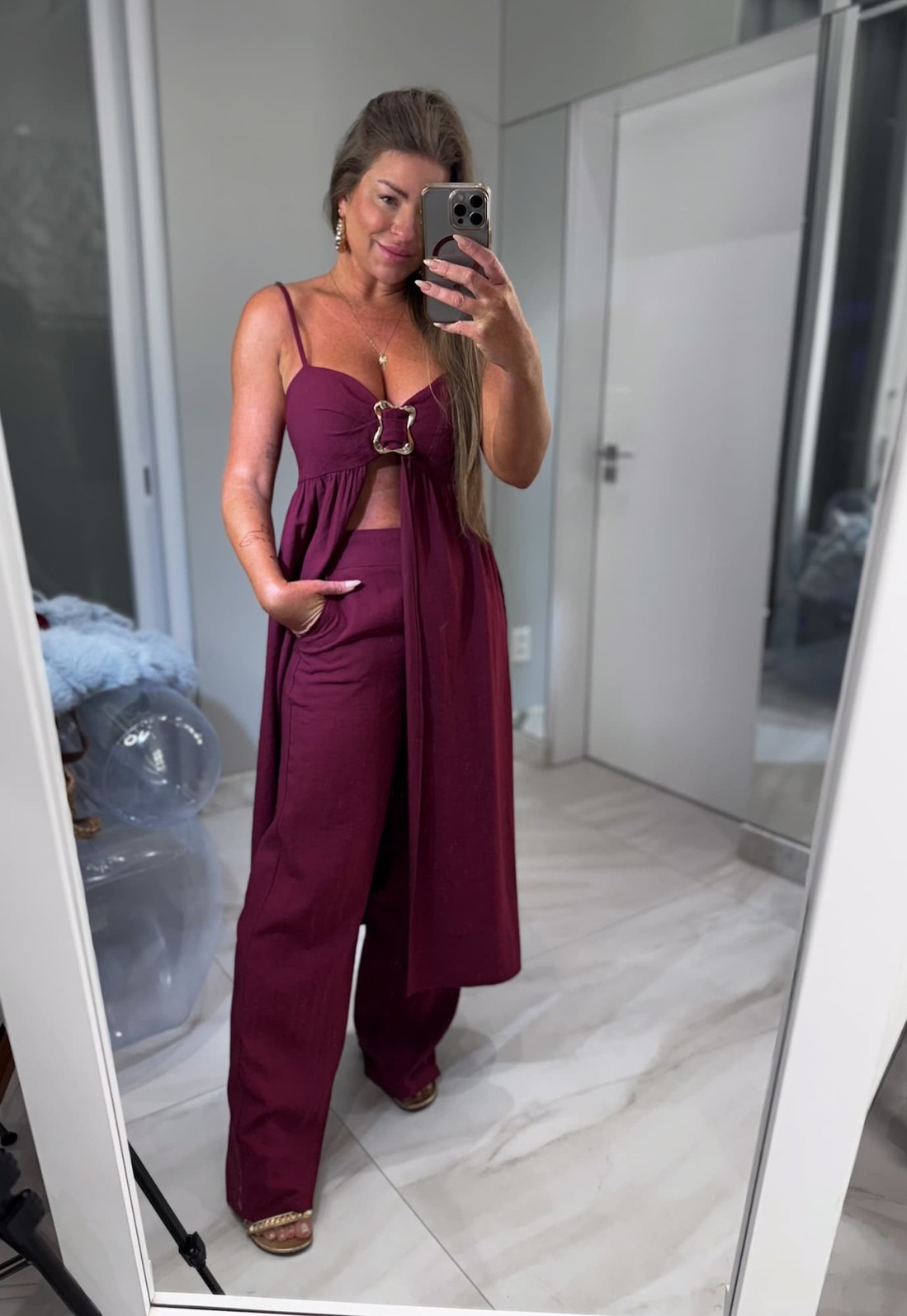 Conjunto de calça mais blusa alongada, possui alça com regulagem e lastex na parte de trás para melhor ajuste, uma fivela dourada na parte da frente como detalhe e com bojo. Aquela abertura na parte da frente dando todo aquele charme e elegância ao look. Veste do P ao G.