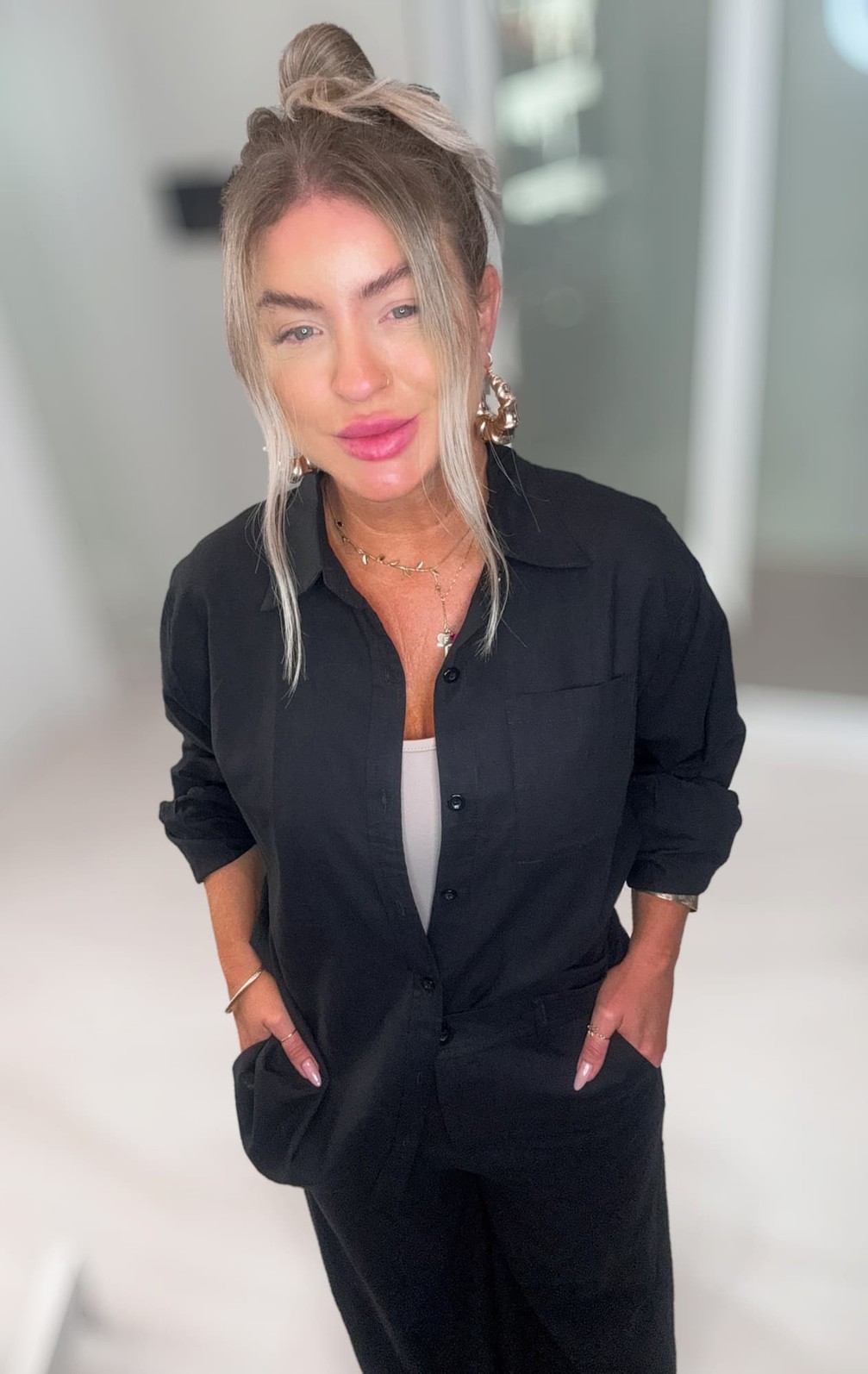 Conjunto em alfaiataria composto por calça que possui elástico na parte de trás com botões na parte da frente, detalhes de bolso faca funcionais. A calça de alfaiataria é uma peça clássica e atemporal, que nunca sai de moda. E camisa alongada com fechamento frontal em botões e bolso funcional.