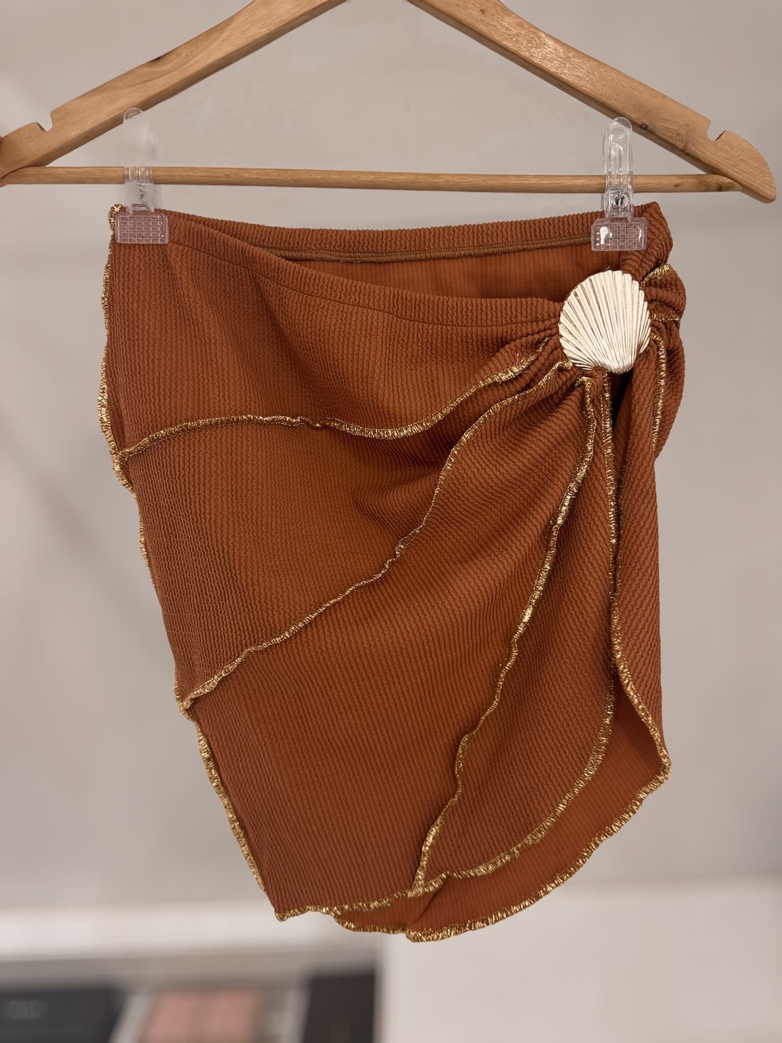 Conjunto top tomara que caia com textura possui detalhes em dourado e elástico na parte de trás para melhor ajuste. Saia assimétrica com detalhes em dourado e concha, também possui calcinha. Ideal para ser usado com saída de praia.
