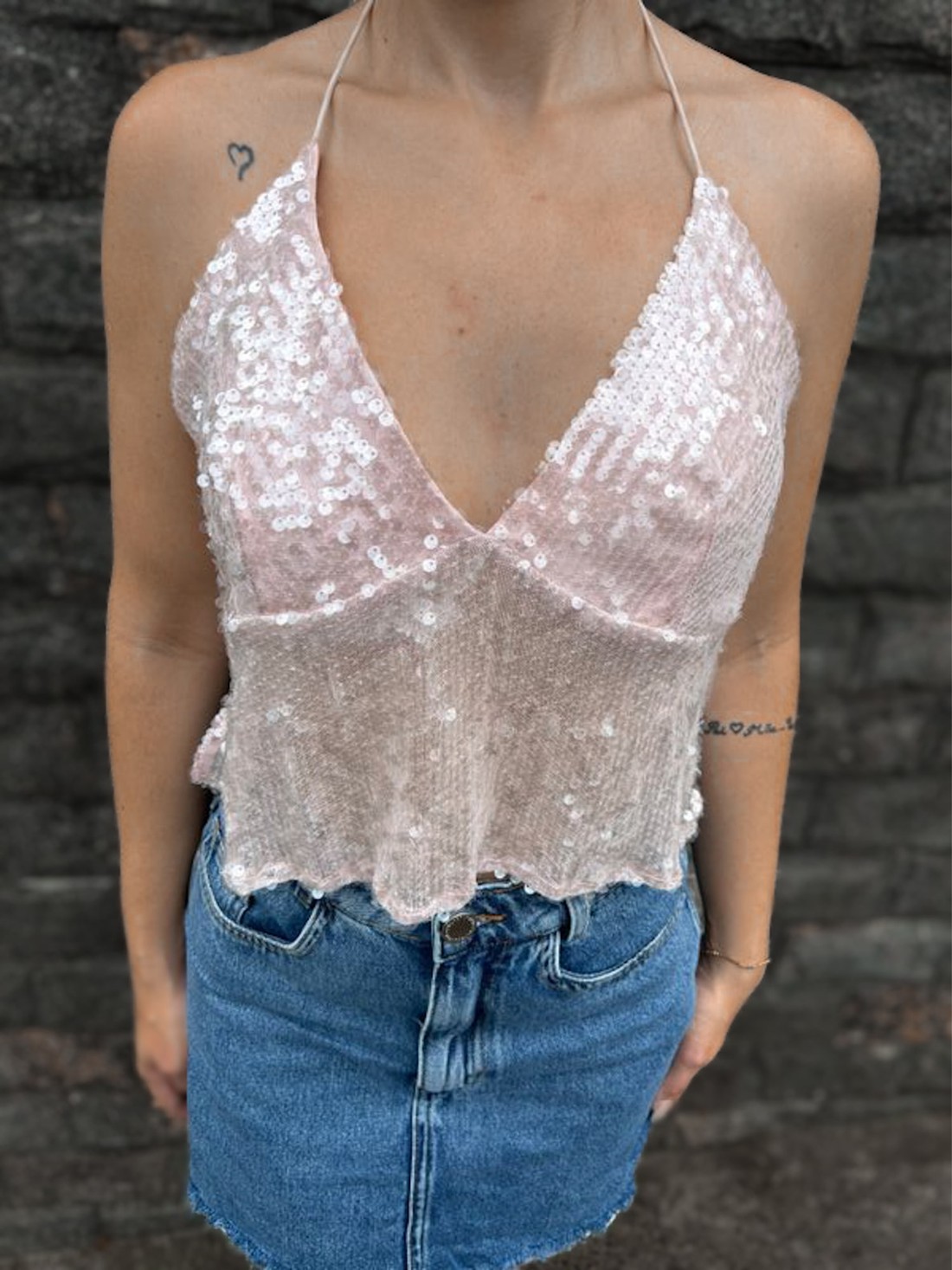 Cropped frente única com aplicações em paetê possui alcinha no pescoço e na parte de trás em elástico para melhor ajuste. Ideal para fazer composições com jeans e arrasar!