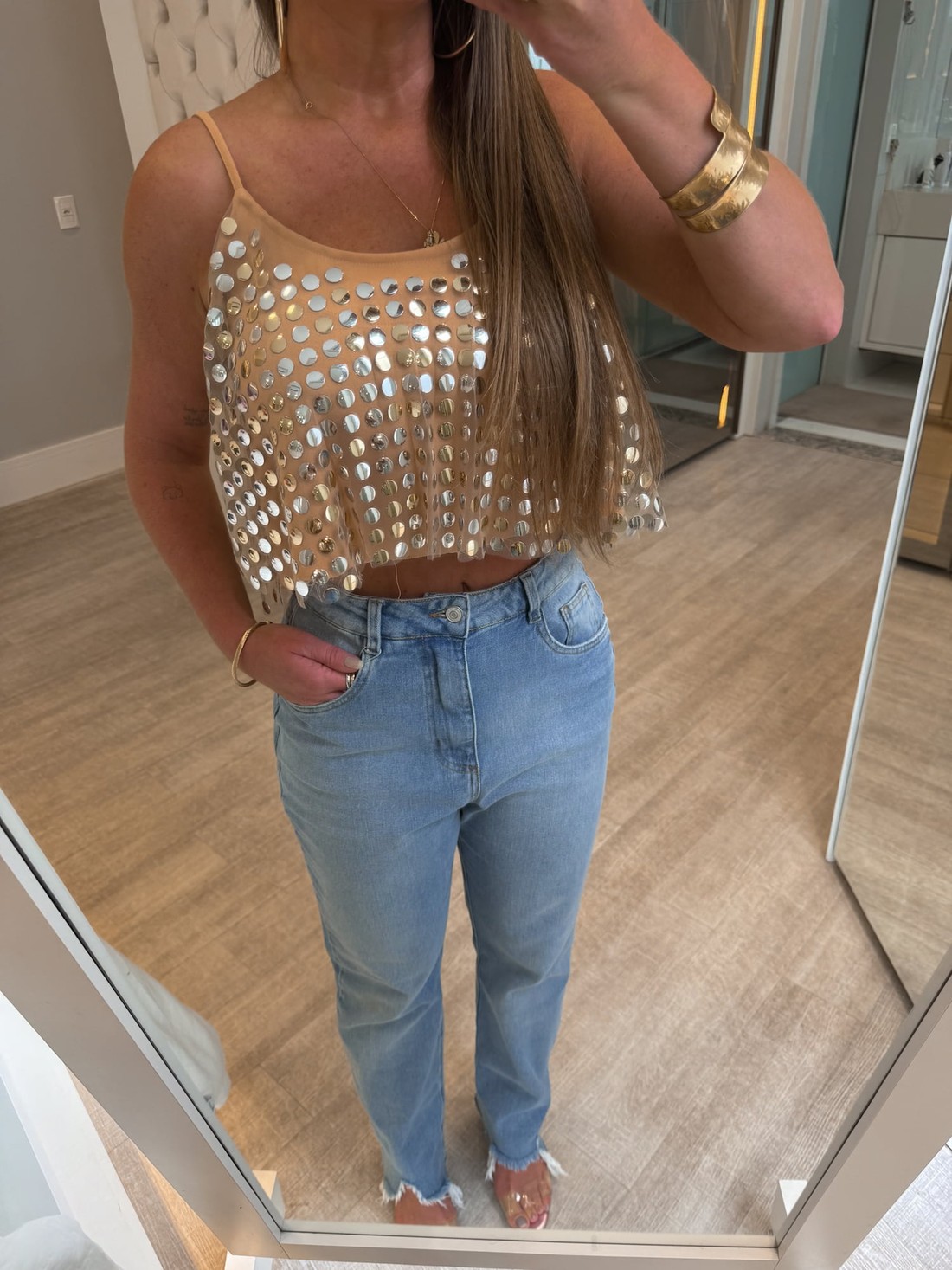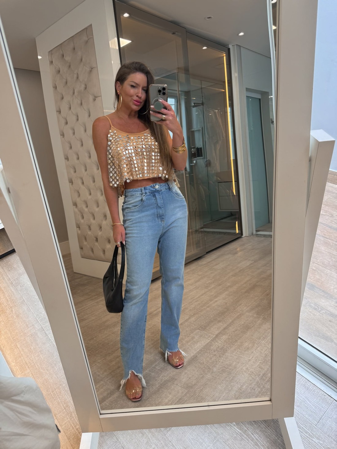 Cropped hot fix com aplicações possui alças reguláveis e elástico na parte de trás para melhor ajuste. Peça estilosa e moderna, para usar e abusar em composições para seus eventos.