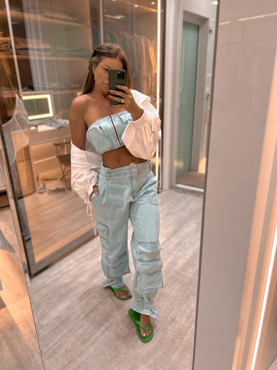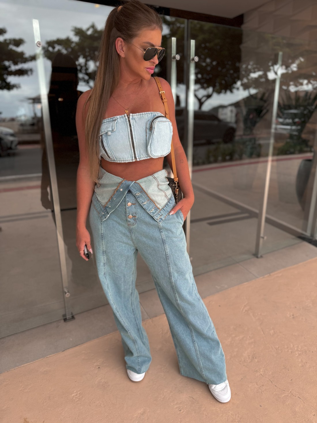Uma peça super estilosa que vai entrar no seu guarda-roupa proporcionando vários looks. Com alças ajustáveis, o cropped jeans possui dois bolsos frontais e zíper aparente que deixa o visual moderno e despojado.