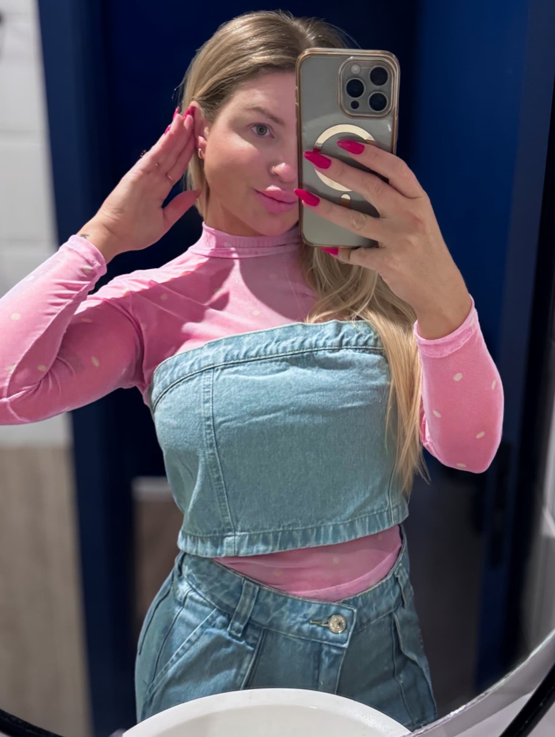 Uma peça de destaque é o cropped jeans, ele possui uma modelagem bem justinha, e fechamento em zíper na parte de trás , modelo tomara que caia . peça cheira de estilo pra você arrasar no look.