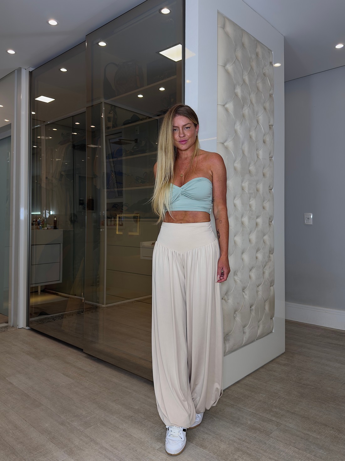 Cropped de modelagem tomara que caia com detalhe no busto , confeccionada em poliamida tecido geladinho com elastico na parte de trás para