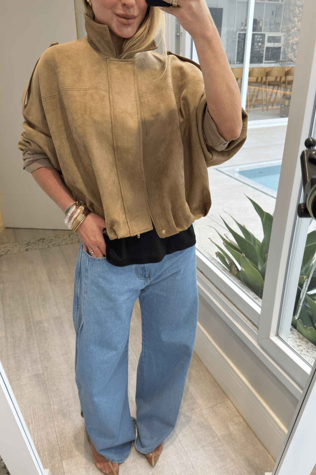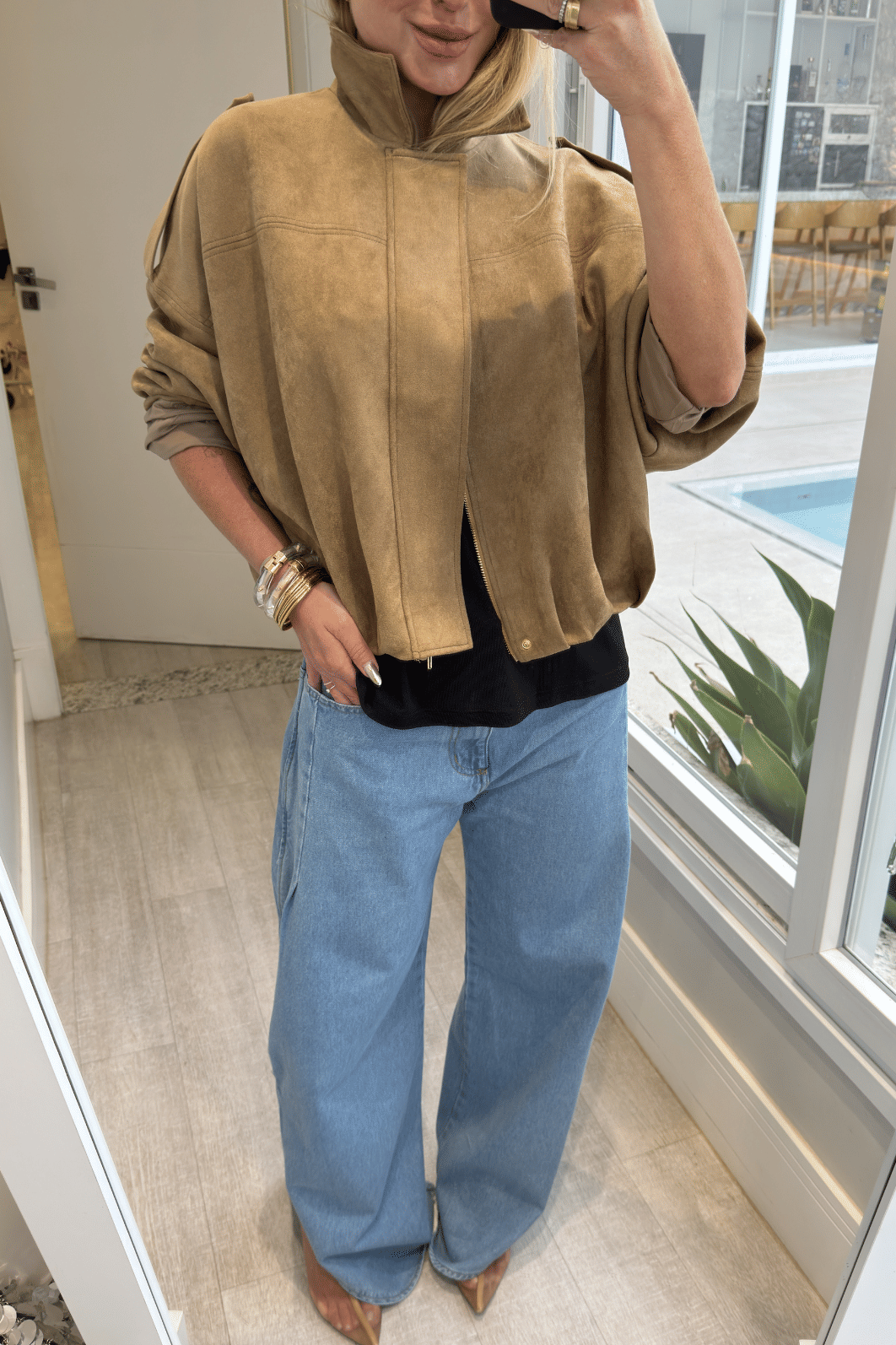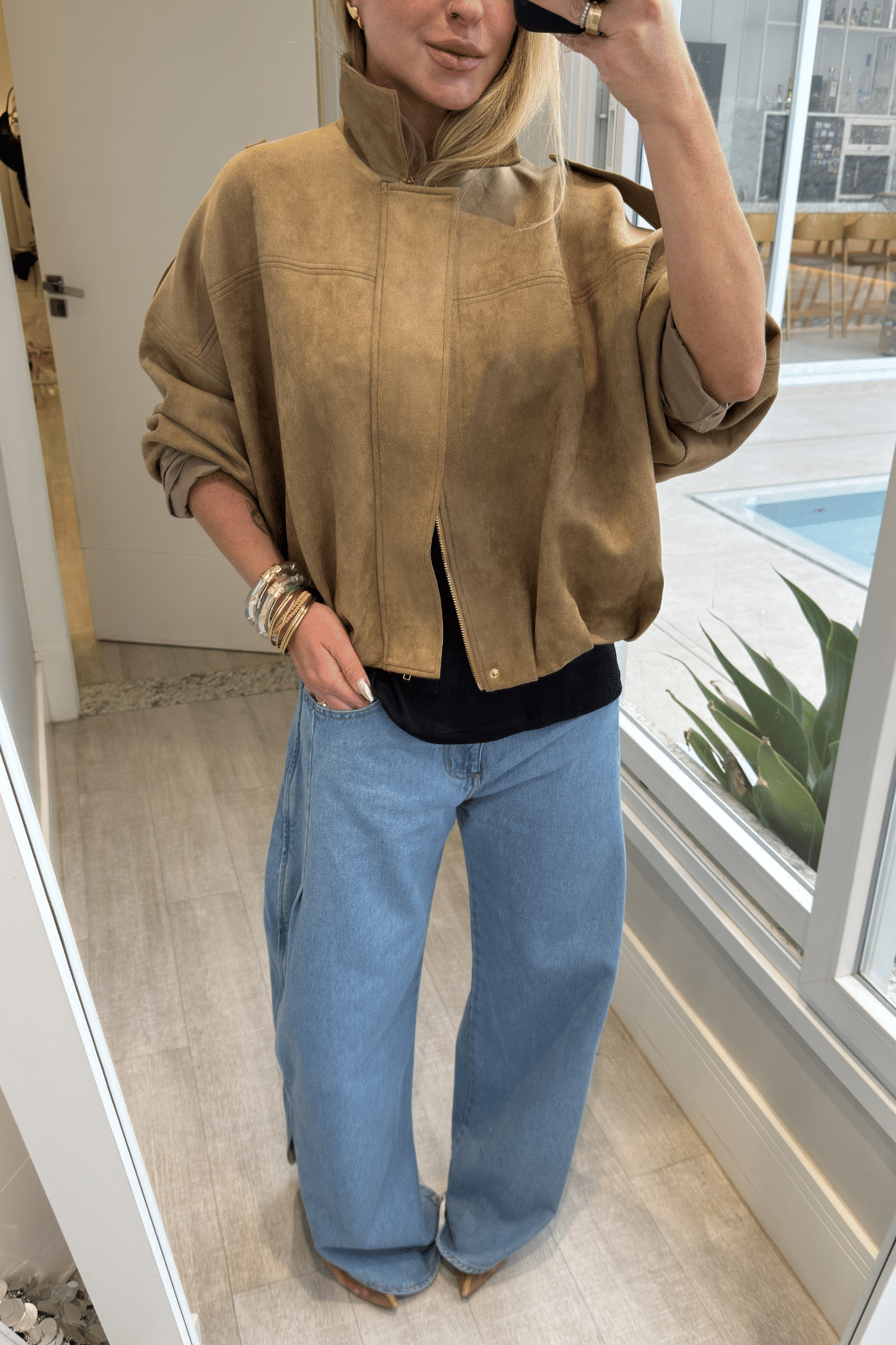 Jaqueta em camurça oferece conforto e flexibilidade. Seu design apresenta modelagem over com ombro deslocado, proporcionando estilo moderno e