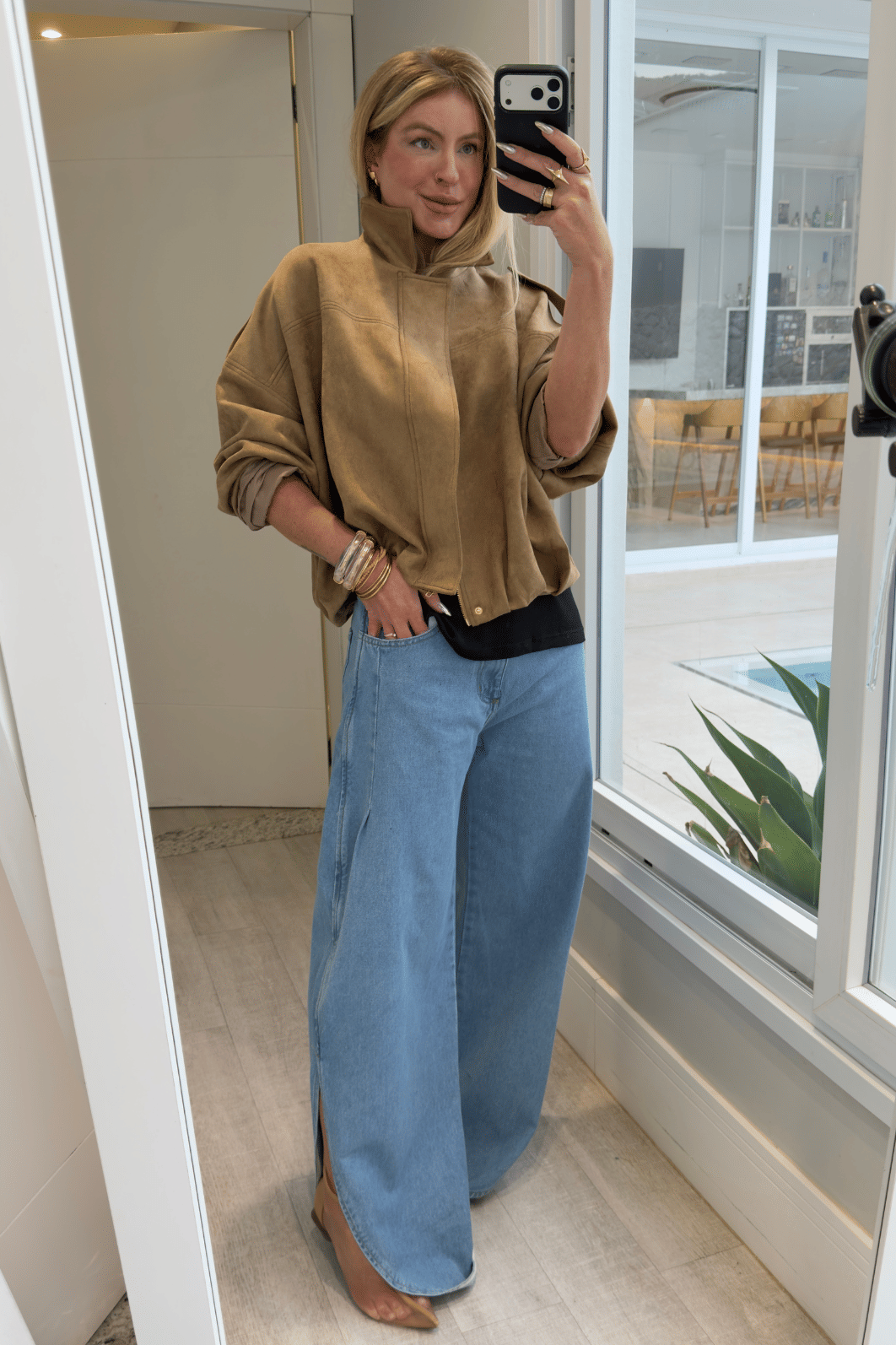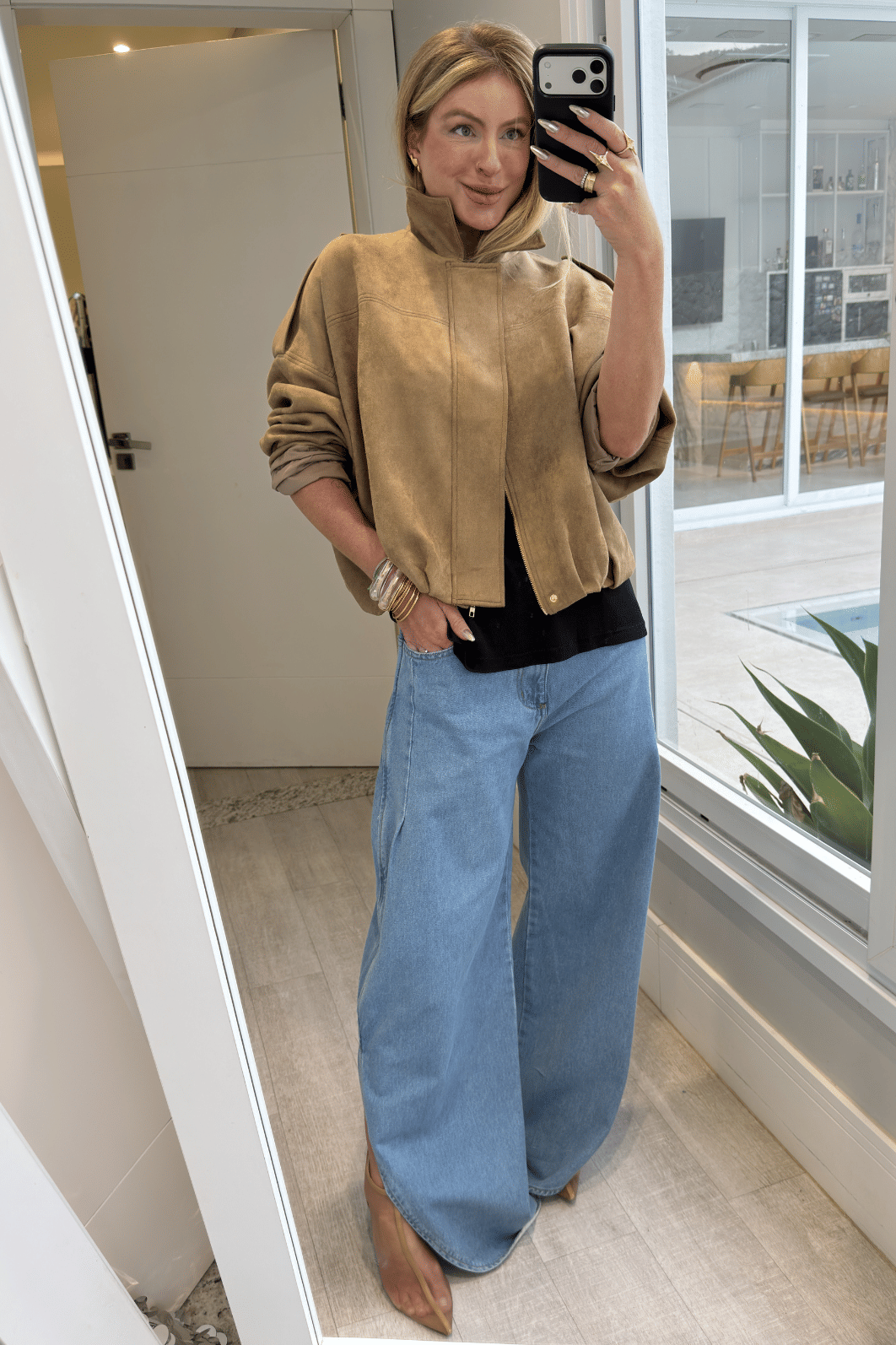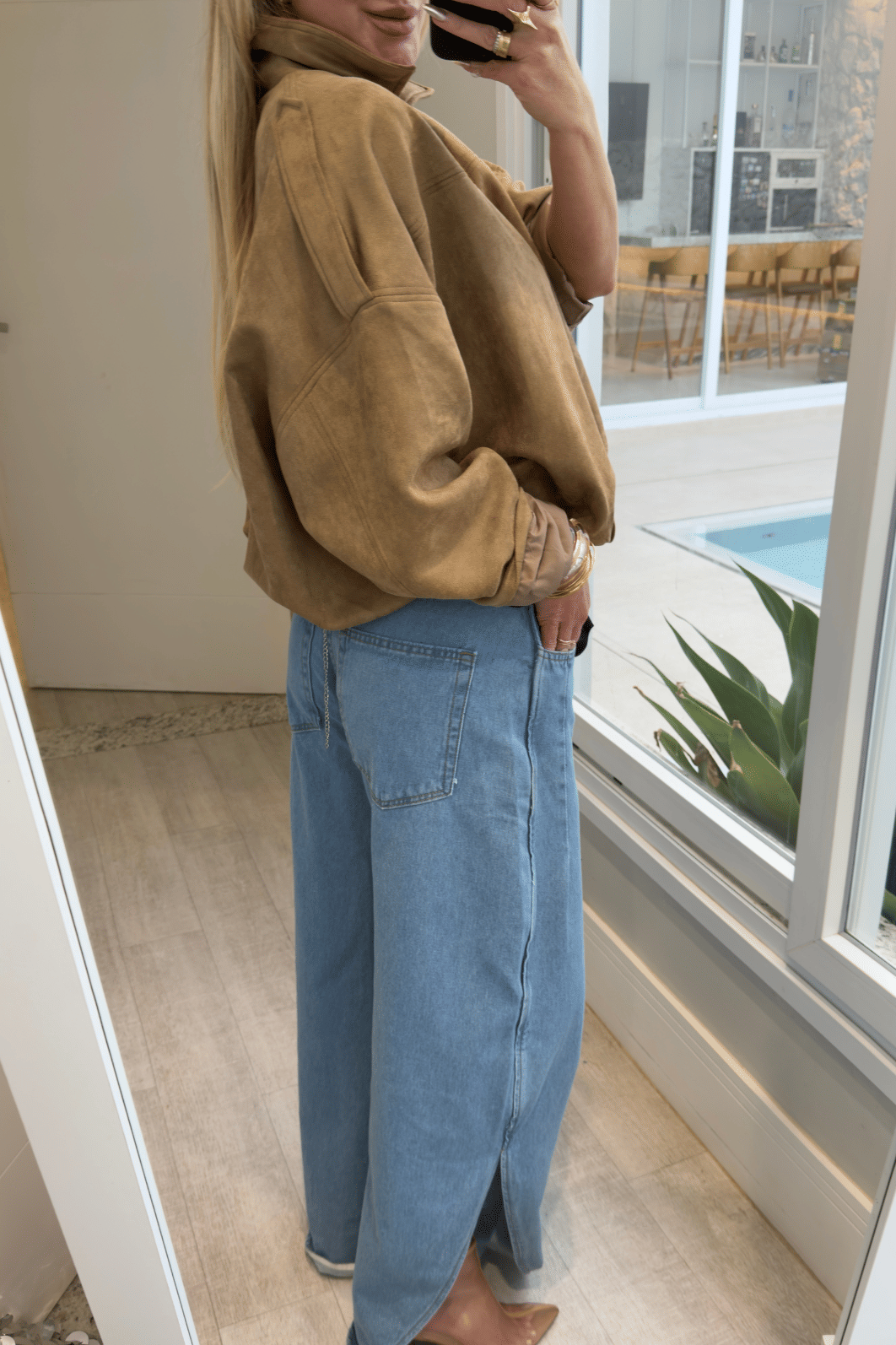 Jaqueta em camurça oferece conforto e flexibilidade. Seu design apresenta modelagem over com ombro deslocado, proporcionando estilo moderno e