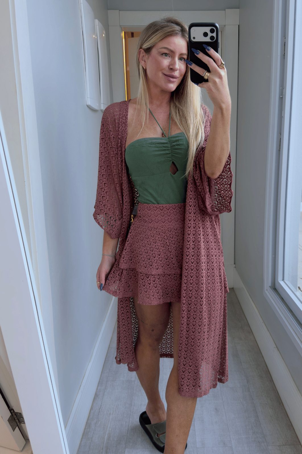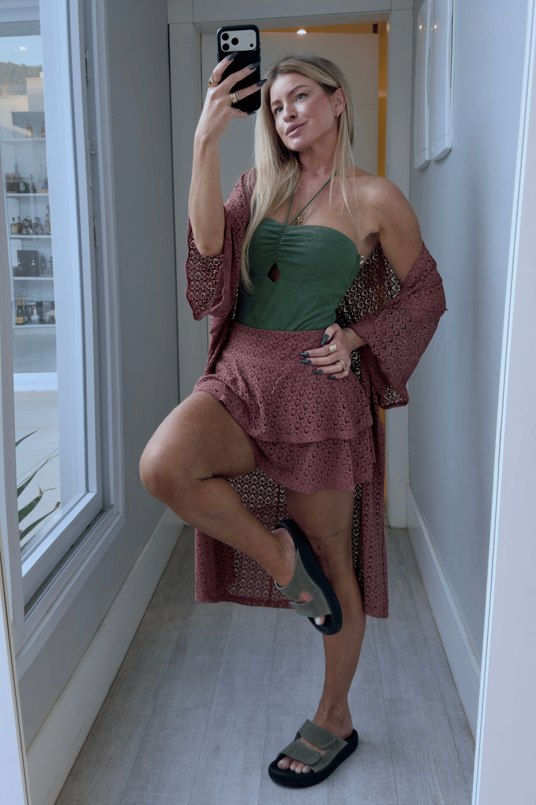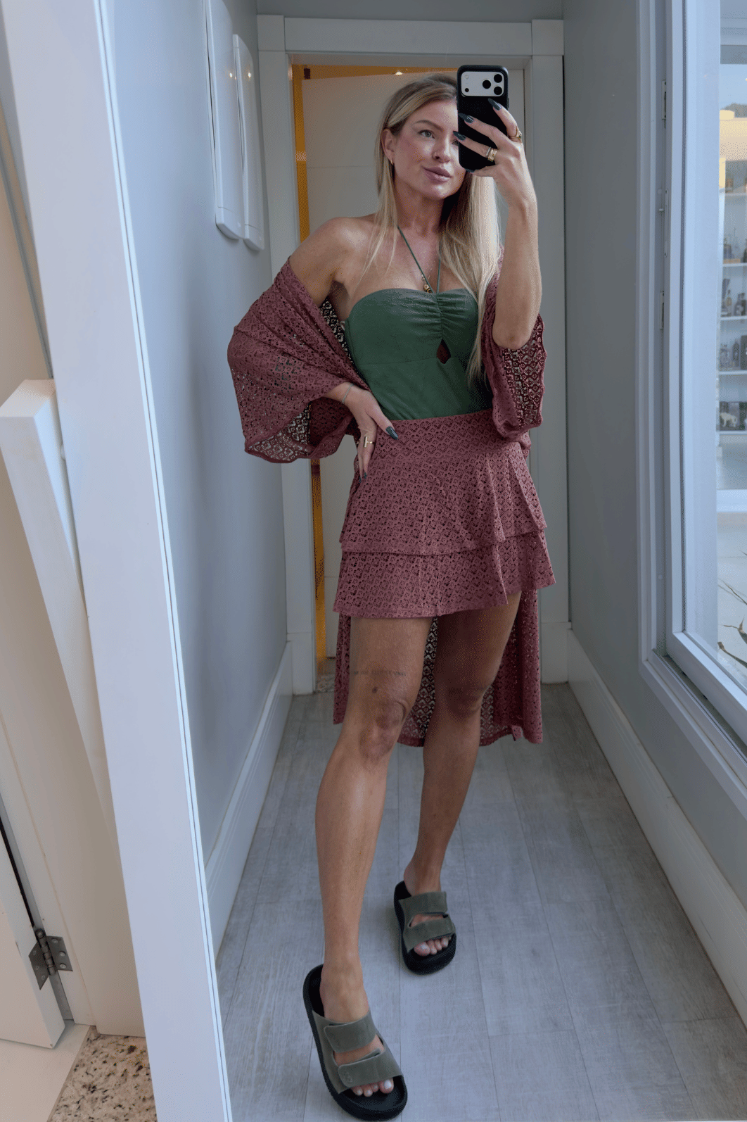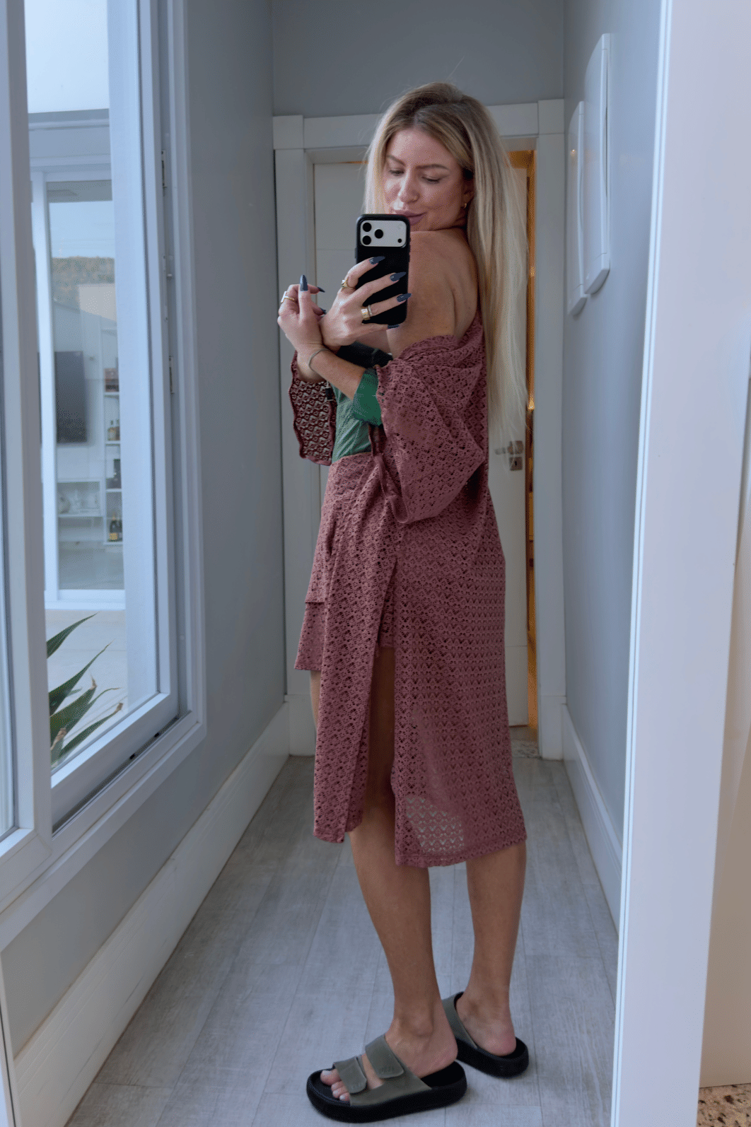 Kimono alongado possui mangas curtas todo com detalhe em vazado. Peça ideal para usar como saída de praia. Veste do p ao G.