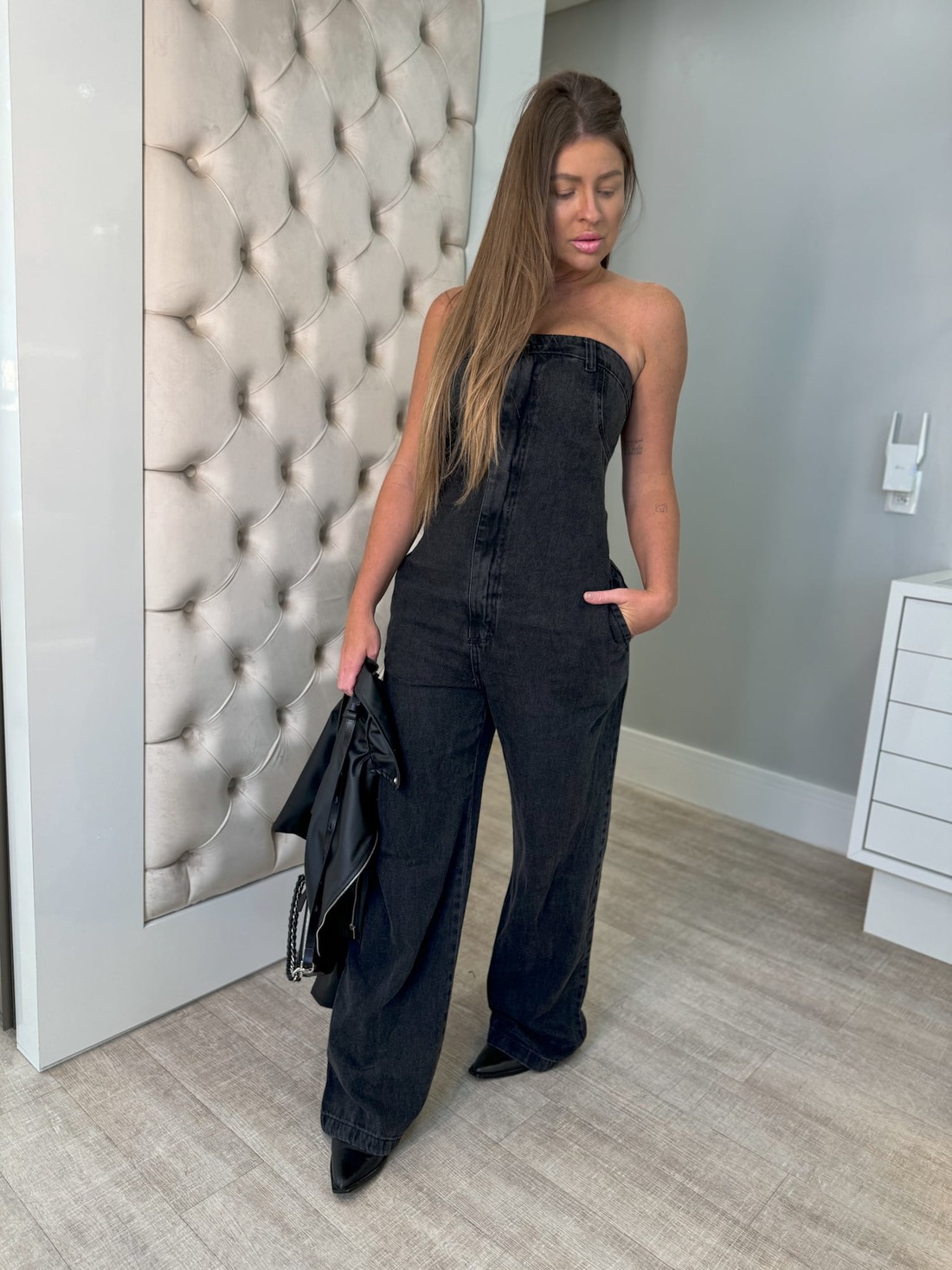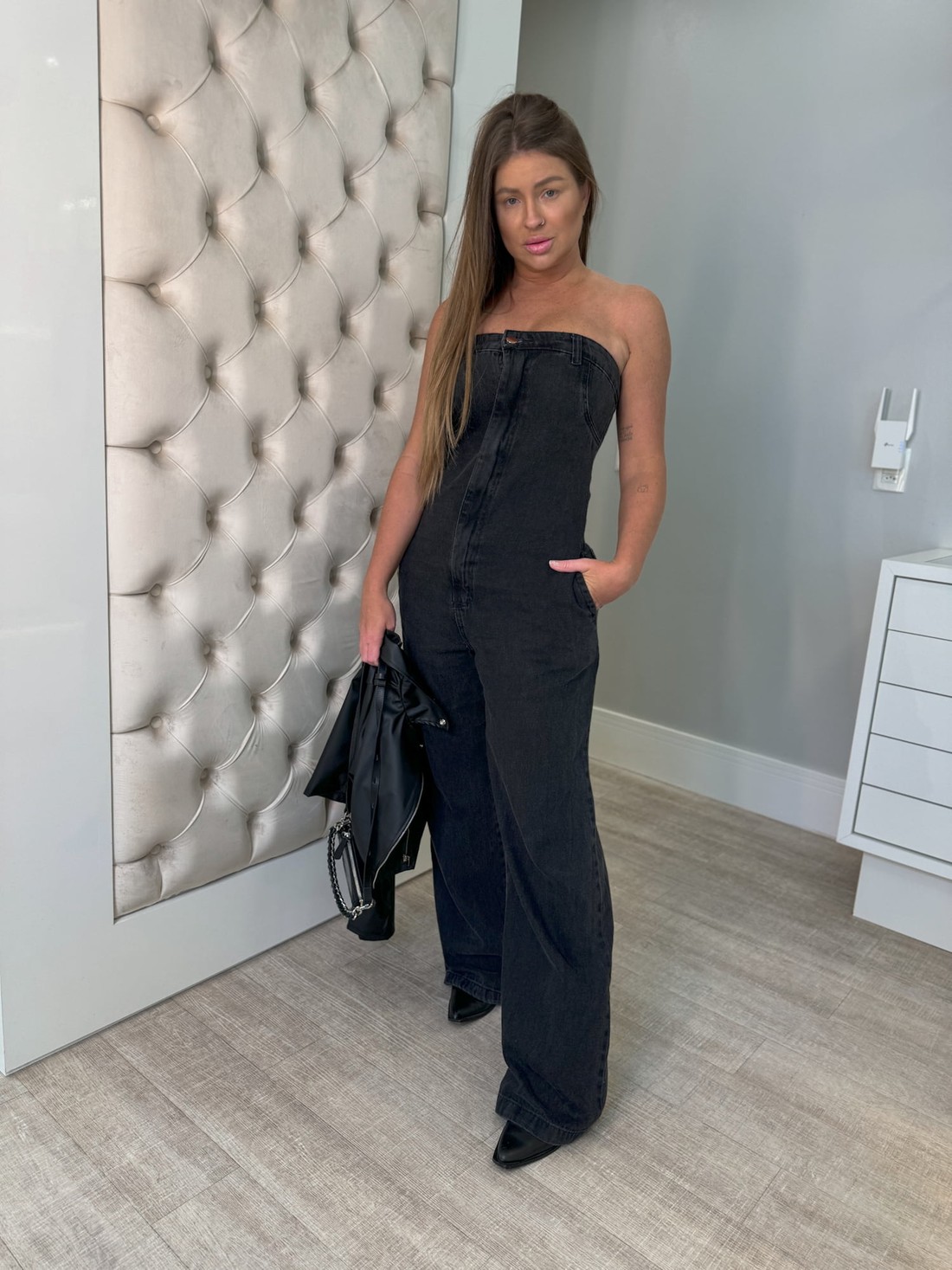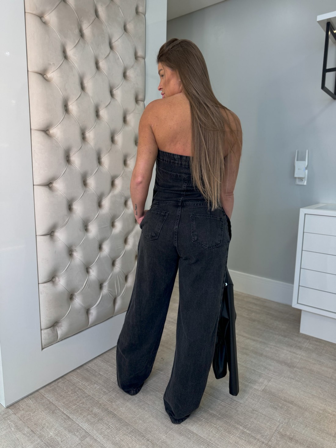Macacão jeans possui bolsos funcionais e fechamento frontal em zíper e botão. Uma peça versátil que pode ser usada tanto de dia quanto a noite, a calça pantalona traz um ar elegante, combine com tênis para transformar o look em algo mais despojado.