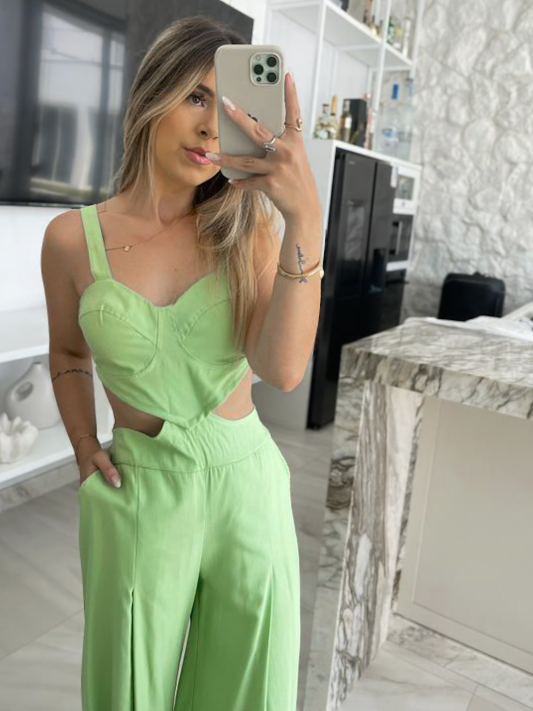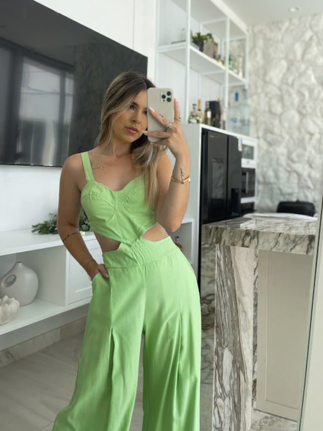 Macacão com modelagem pantalona, possui elástico na cintura, bojo e amarração na de parte de trás para melhor ajuste. Lindo e moderno um look para você arrasar.
