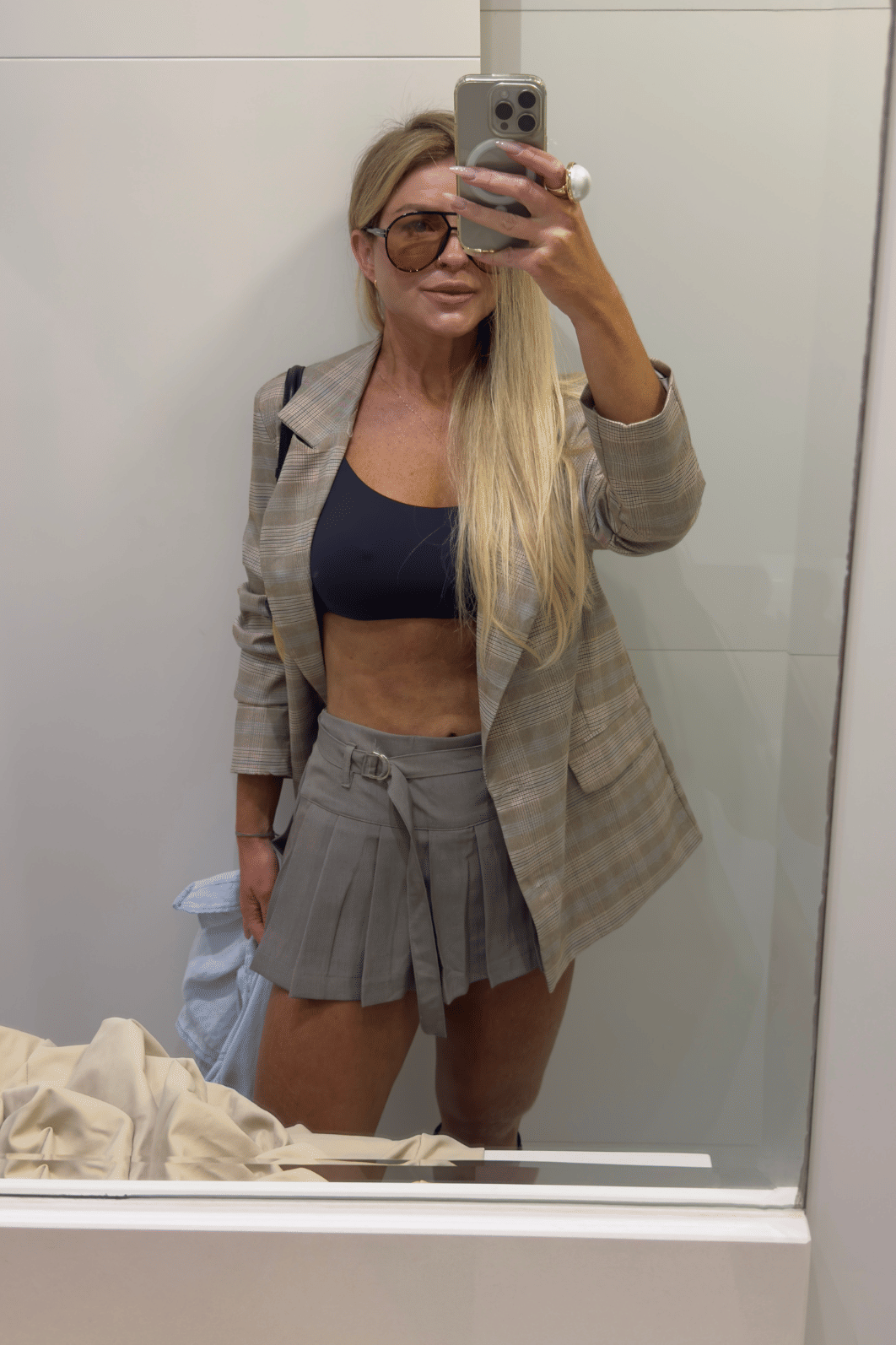 A saia colegial é aquele modelo coringa Com modelagem evasê, bem solta e com volume, Apresenta camadas de babados assimétricos sobrepostos,