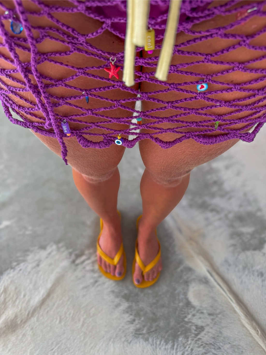 Saia curta confeccionada em crochê com ponto aberto, possui ajuste de amarração na cintura vestindo do P ao GG. Perfeita para compor looks de praia, com detalhes em miçangas proporcionando ainda mais charme a peça, a cara do verão!