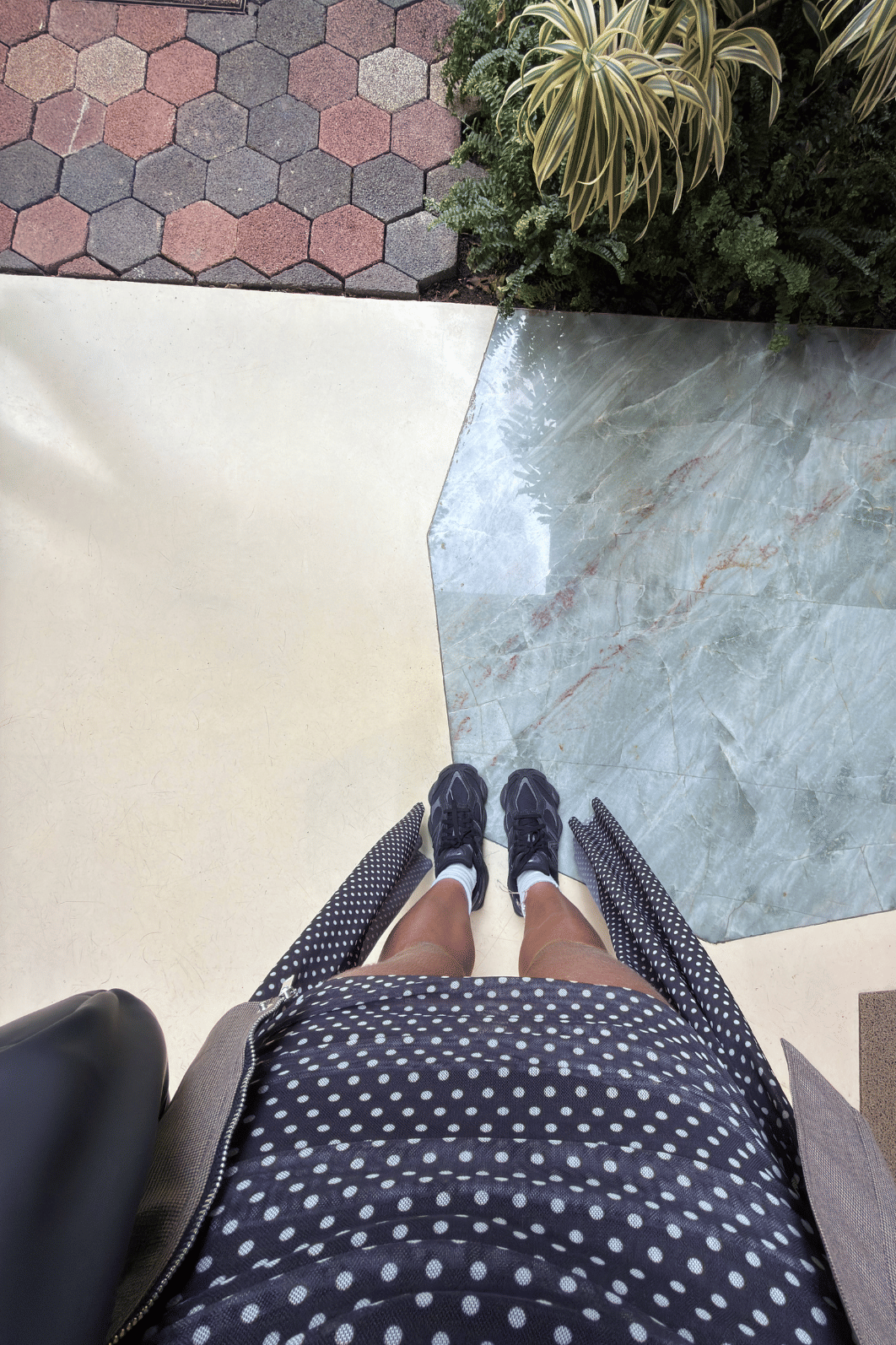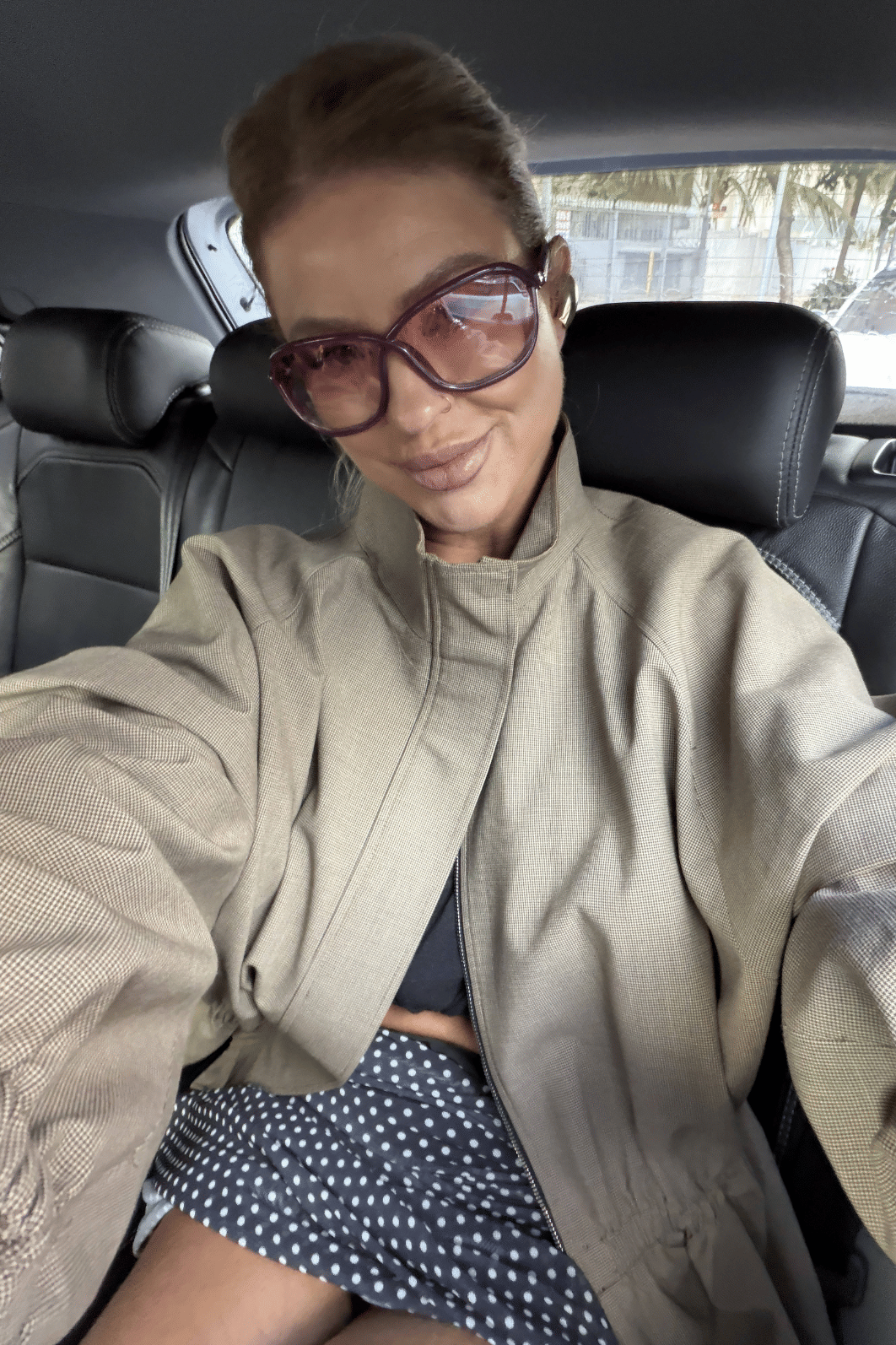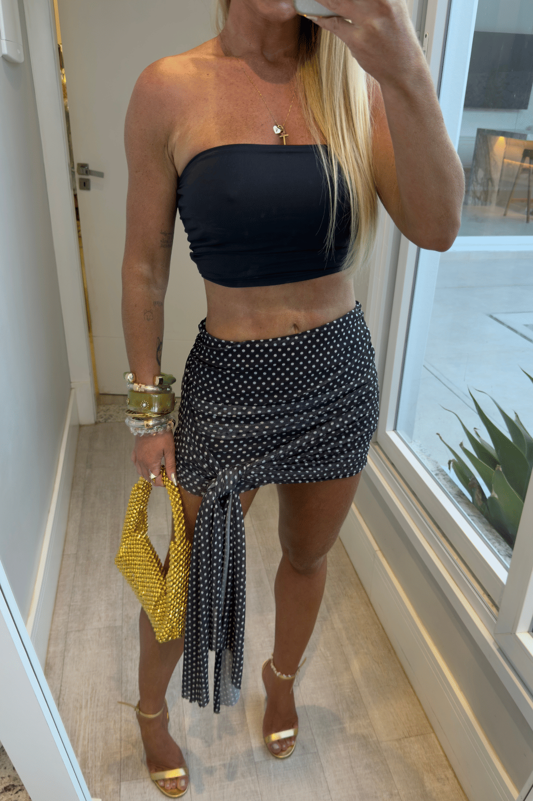 Saia curta confeccionada em tule leve e transparente, com estampa de poá (bolinhas), sobre forro ajustado ao corpo. Possui modelagem levemente franzida na lateral, criando um efeito drapeado que valoriza a silhueta. O comprimento é mini e o caimento é fluido, trazendo movimento e leveza ao look. A transparência sutil do tule combinada ao forro garante equilíbrio entre sensualidade e elegância.