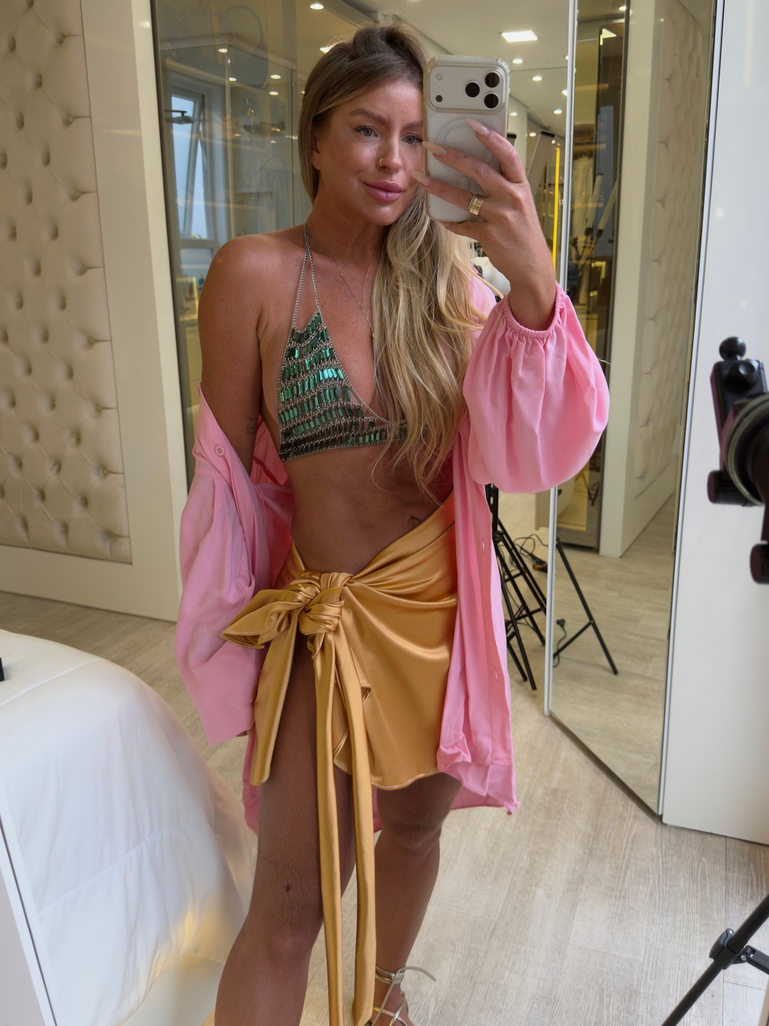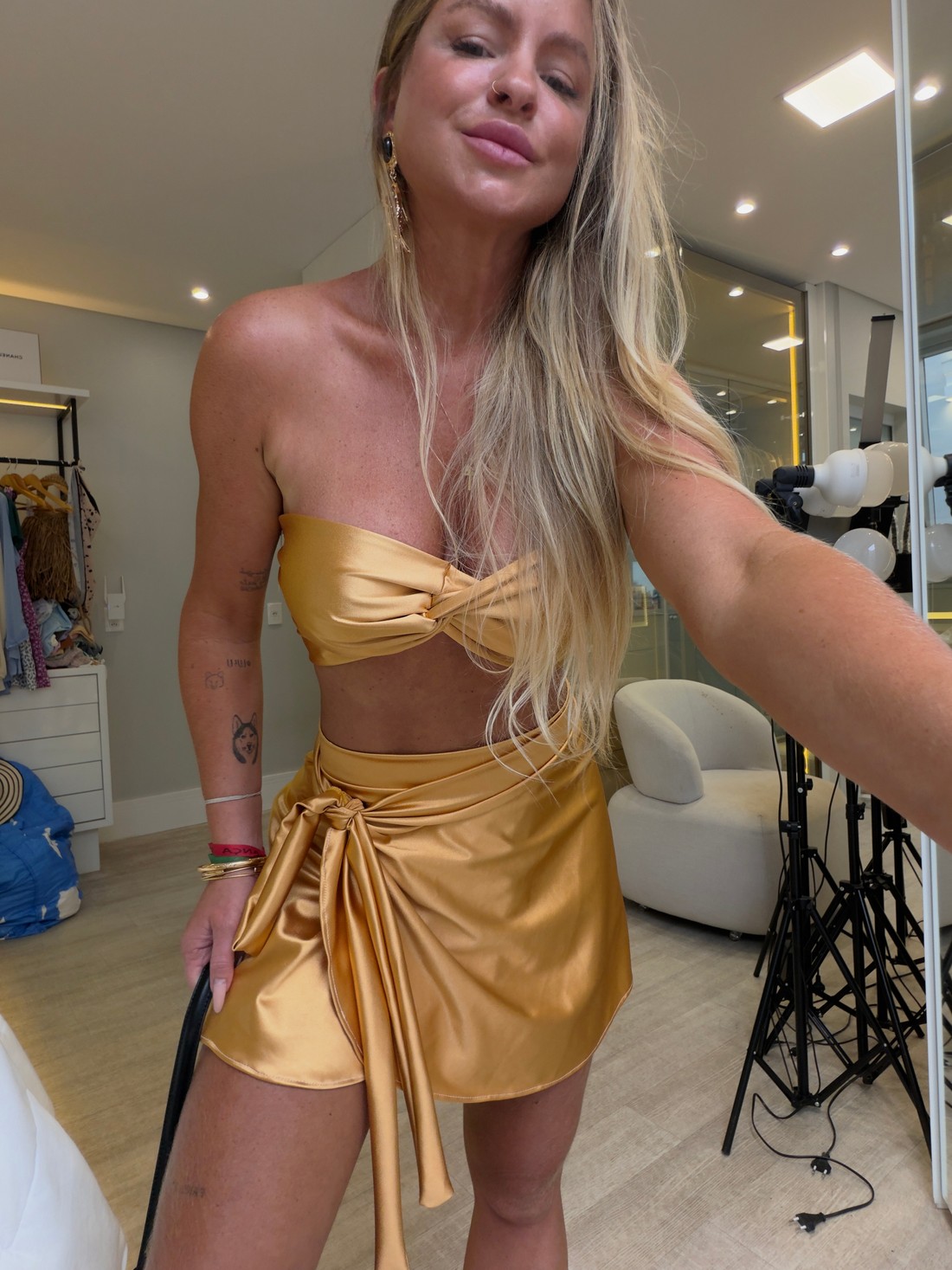 Saia curta de amarração envelope transpassada dourada com caimento leve e comprimento curto. Uma peça coringa no seu guarda roupa, sendo possível