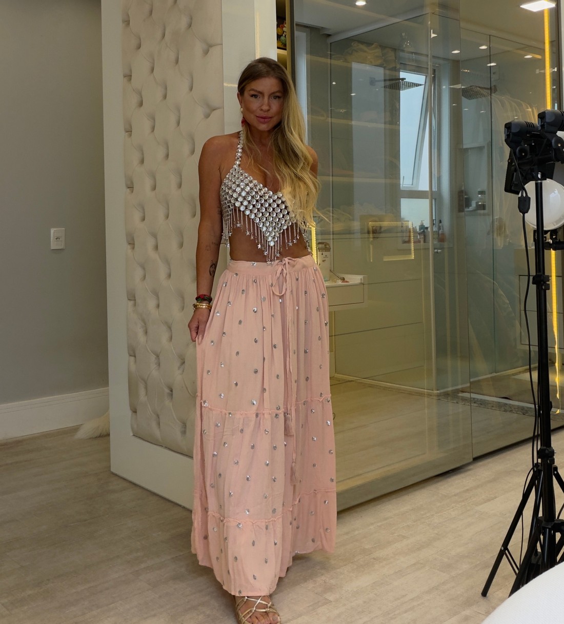 Saia de comprimento longo, possui amarração na cintura pra melhor ajuste ao corpo. Com detalhes em paete proporcionando mais elegância