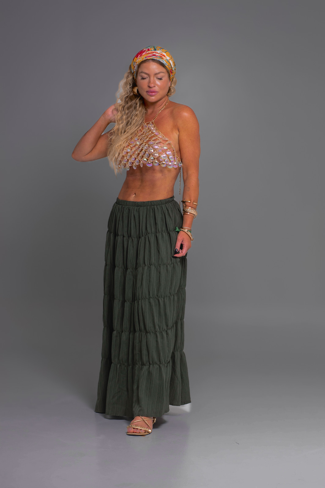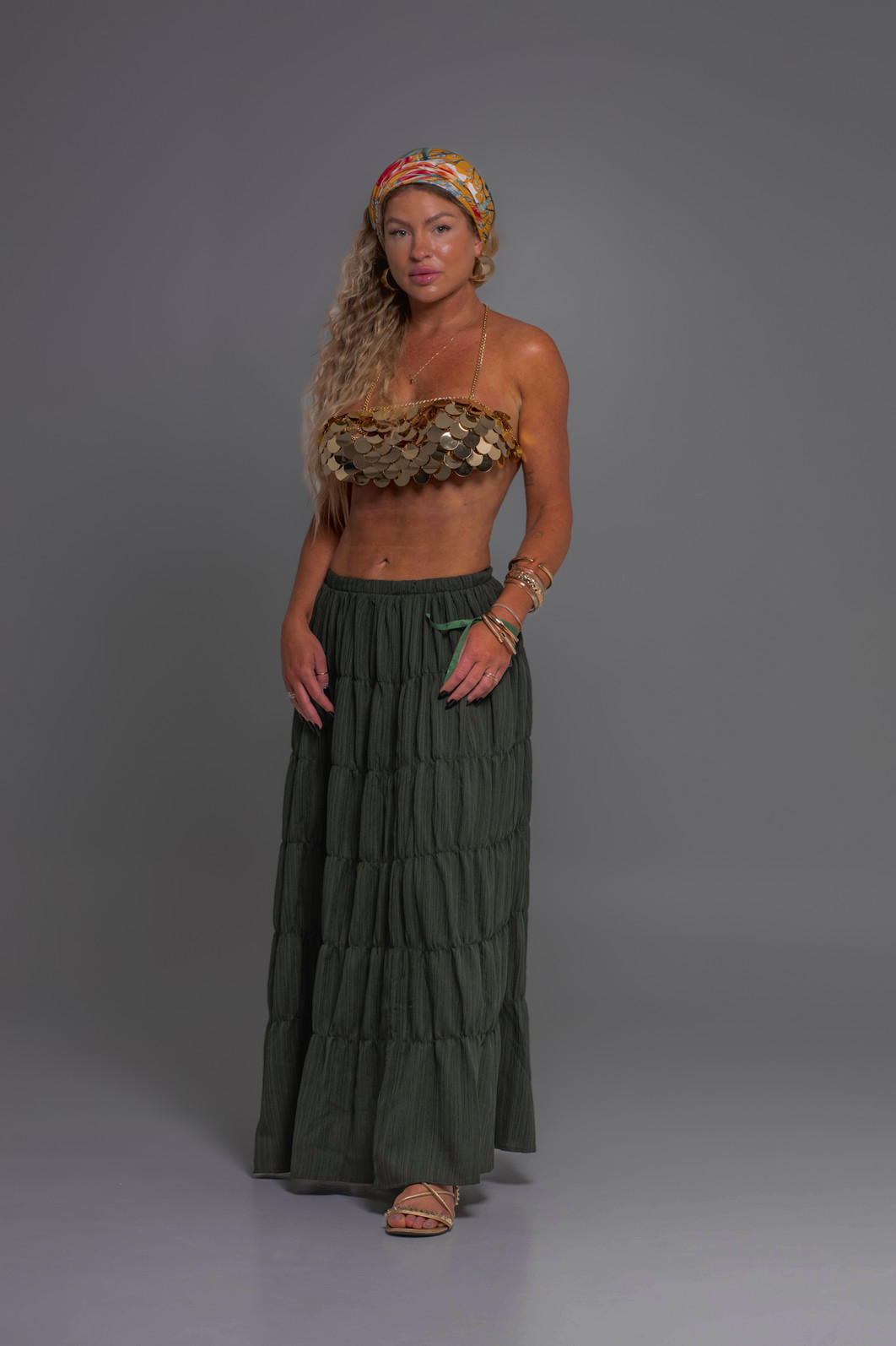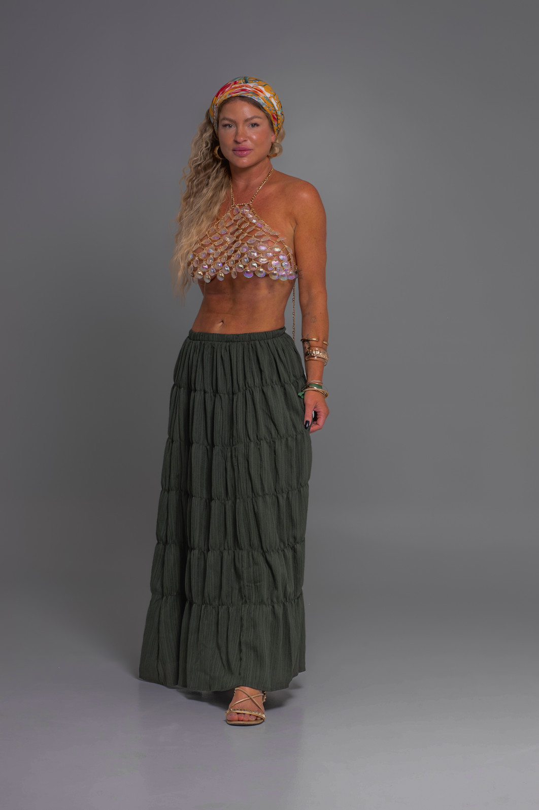 Saia de comprimento longo, possui elástico na cintura para melhor ajuste ao corpo. Com detalhes em franzido proporcionando maiselegância a peça.