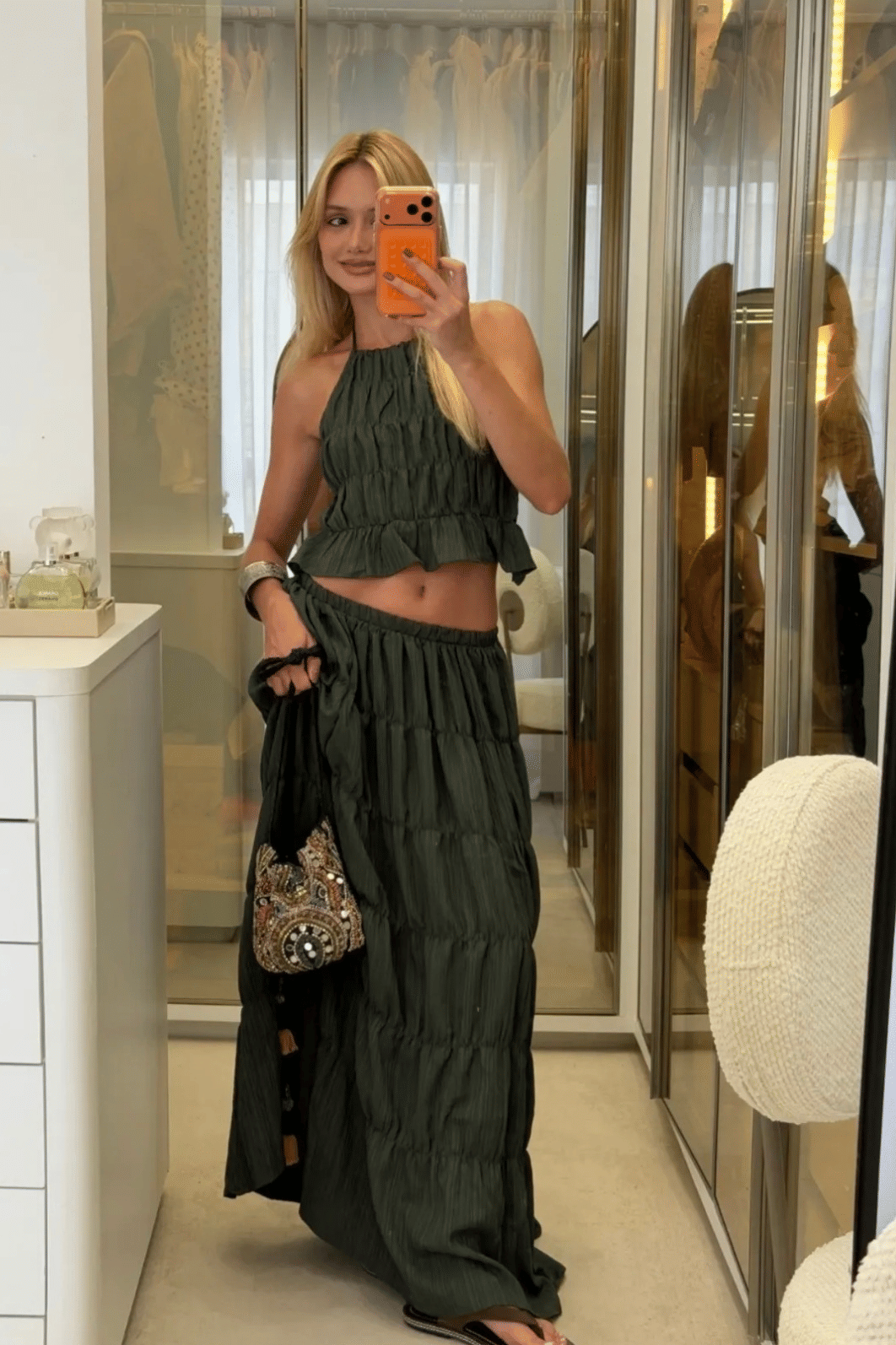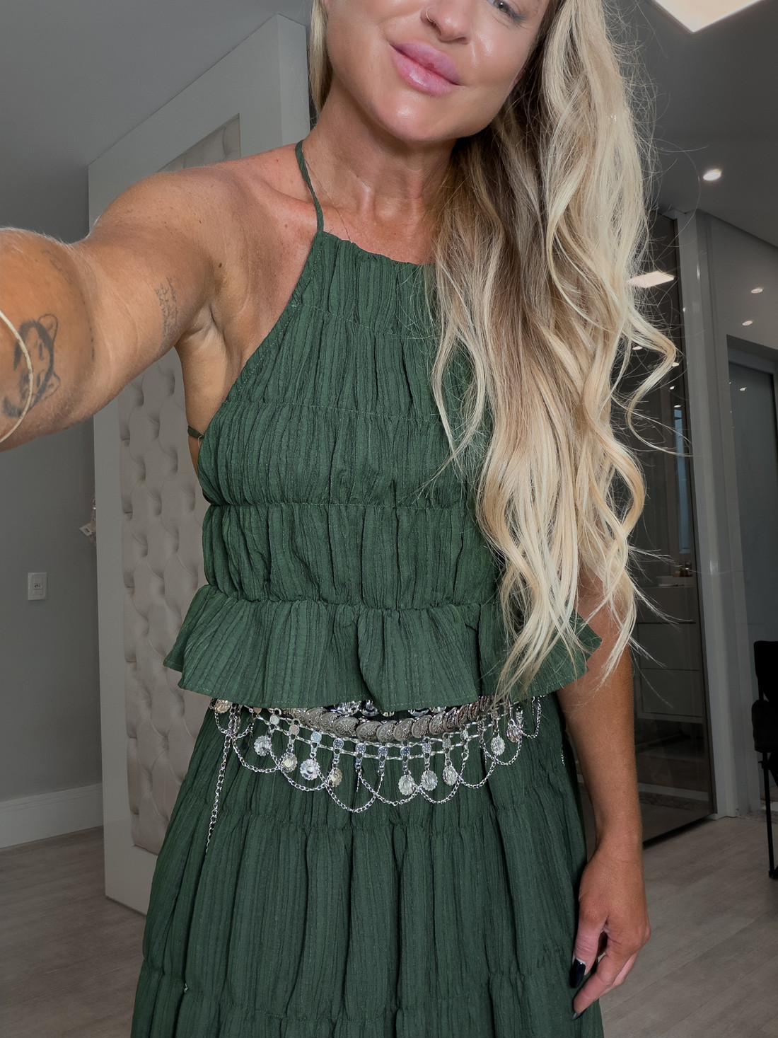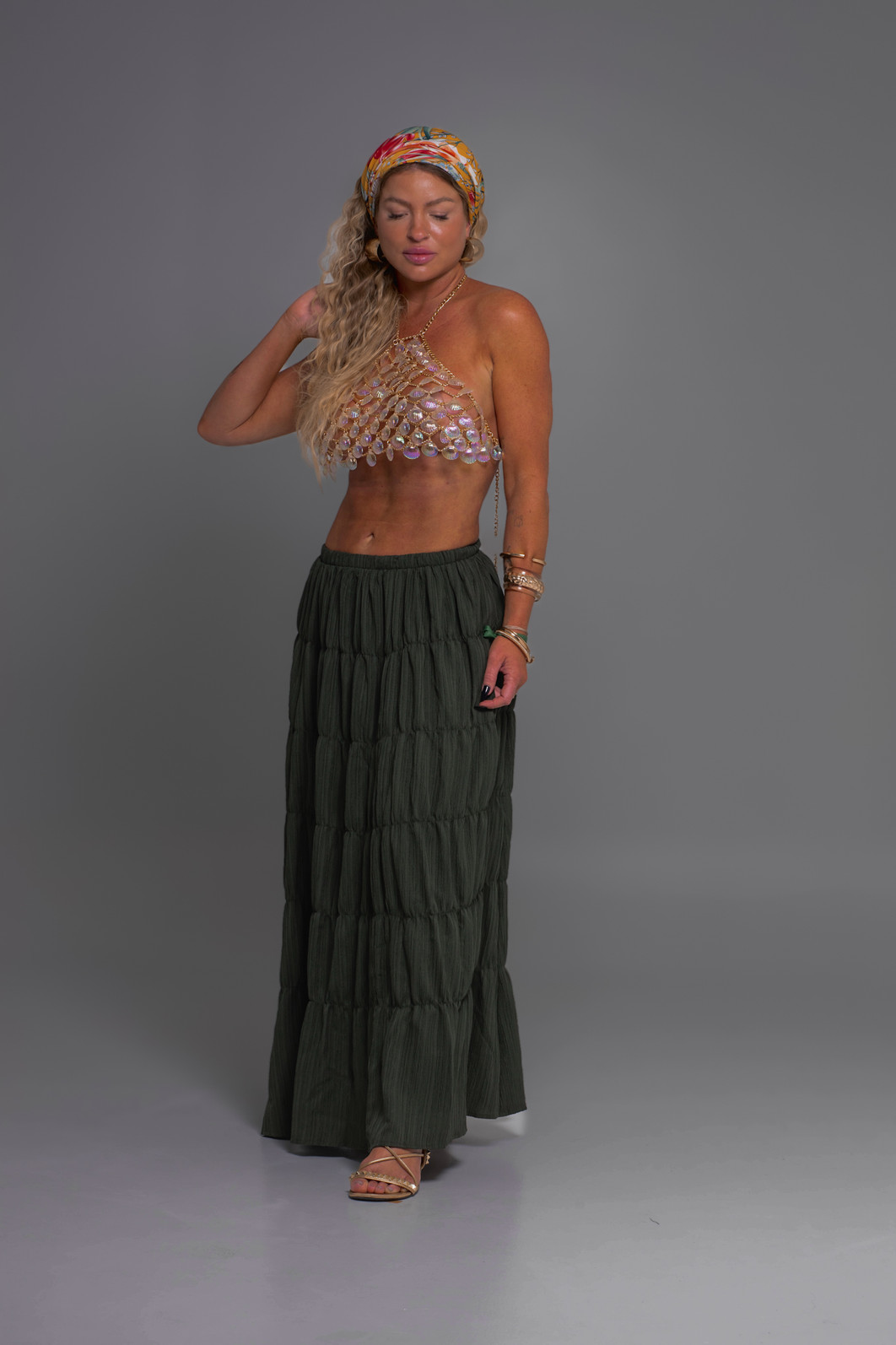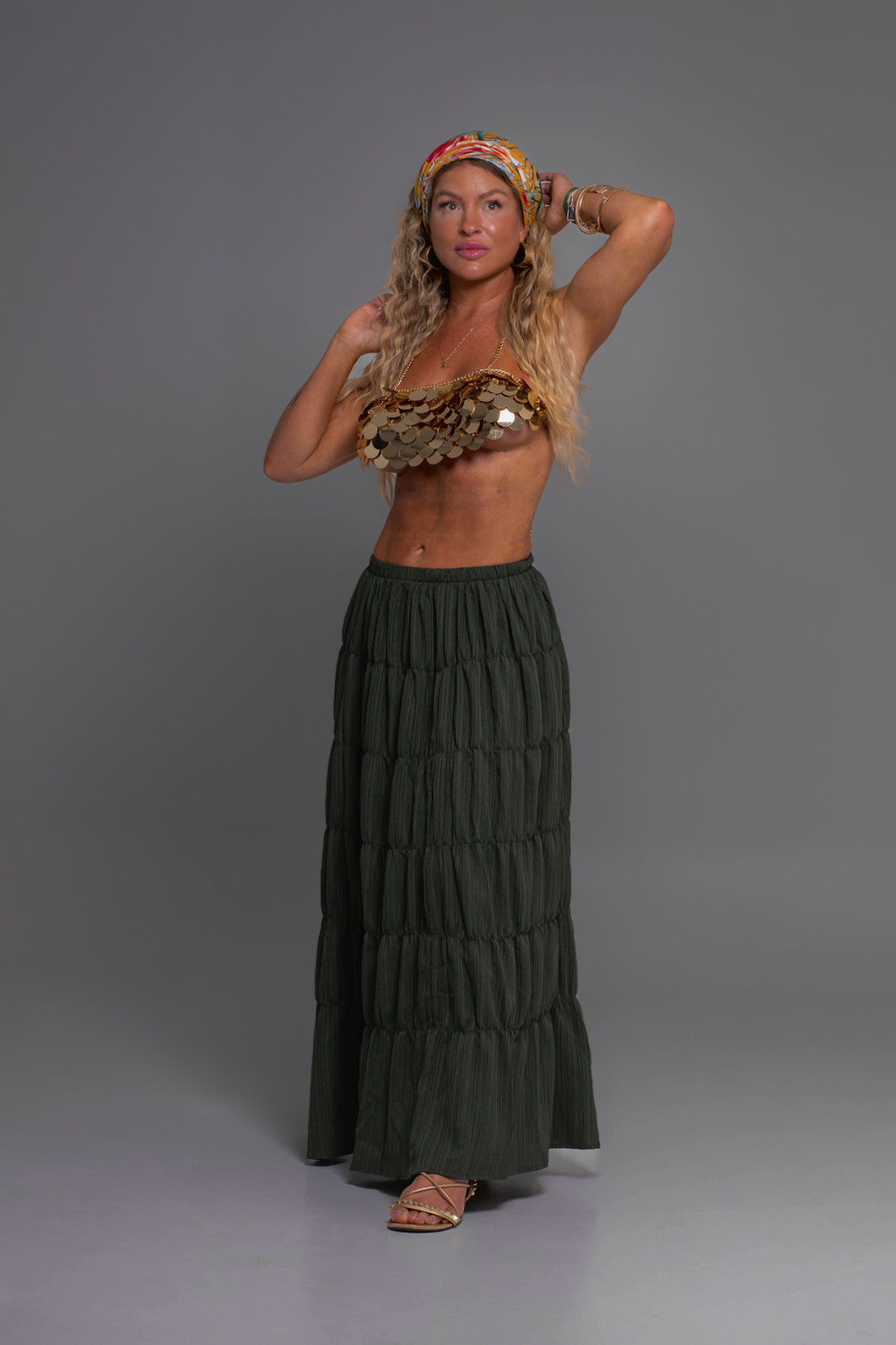 Saia de comprimento longo, possui elástico na cintura para melhor ajuste ao corpo. Com detalhes em franzido proporcionando maiselegância a peça.