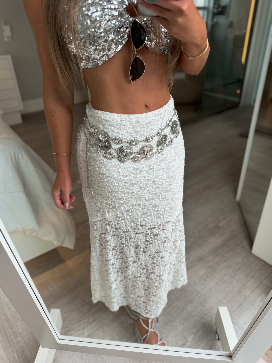 Saia de comprimento midi confeccionada em renda com forro curto e transparência na parte de baixo, possui modelagem soltinha. O desenho na renda faz dela uma peça rica em detalhes e a cara do verão.