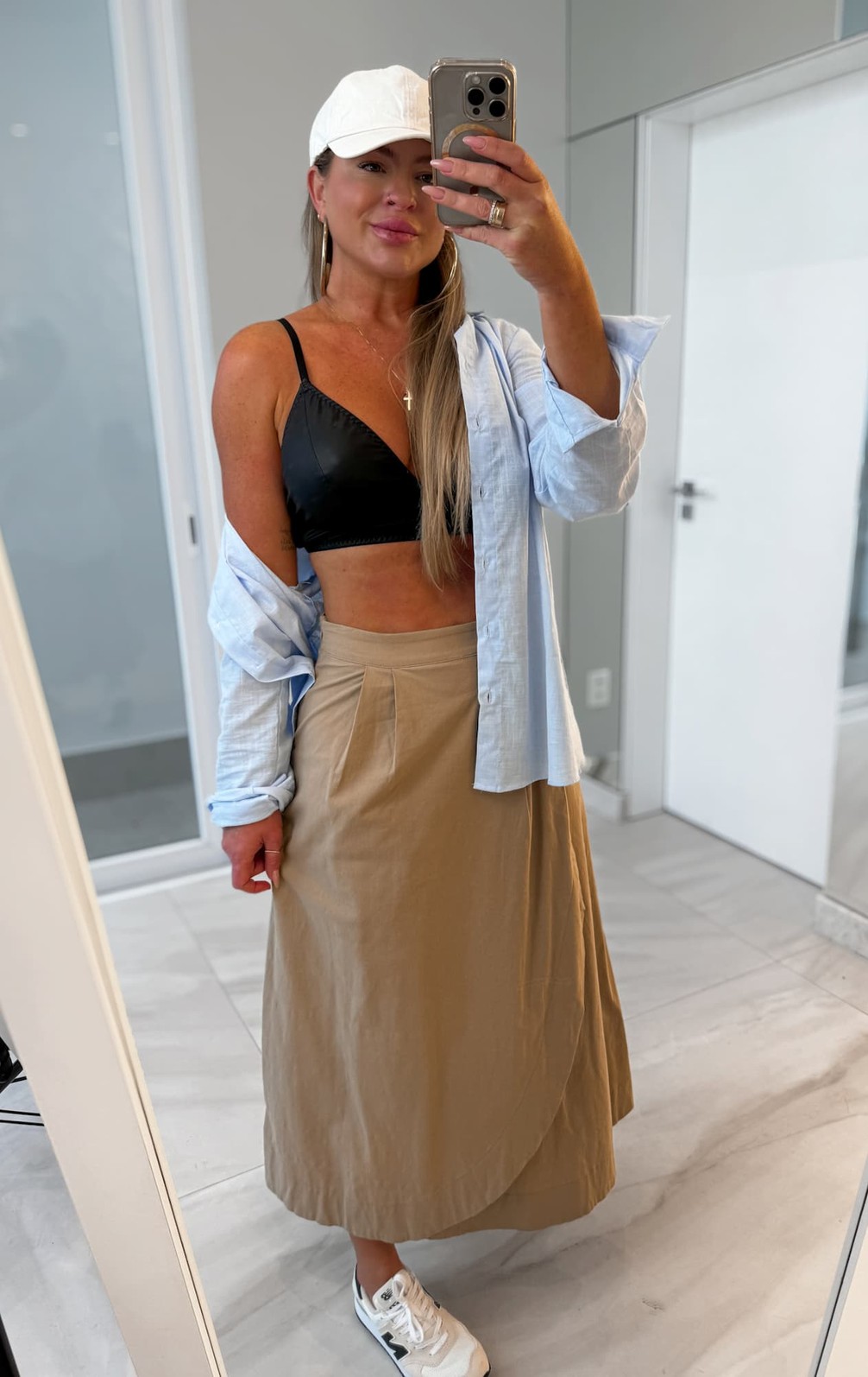 Saia midi em viscolinho possui fechamento na lateral em zíper e detalhe em transpassado na parte frontal, uma peça versátil podendo ser usada de diversas maneiras, tanto mais casuais como mais esportiva.