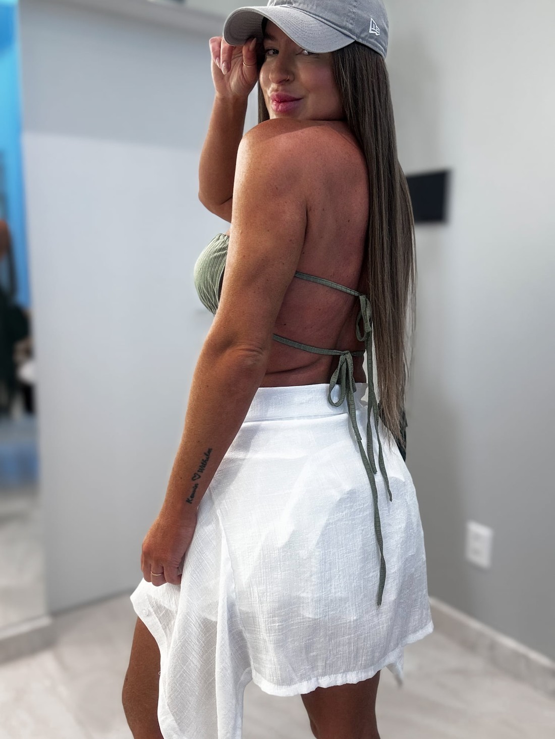 Top canelado possui amarração na parte das costas com detalhe vazado no busto. Para compor diversos looks.